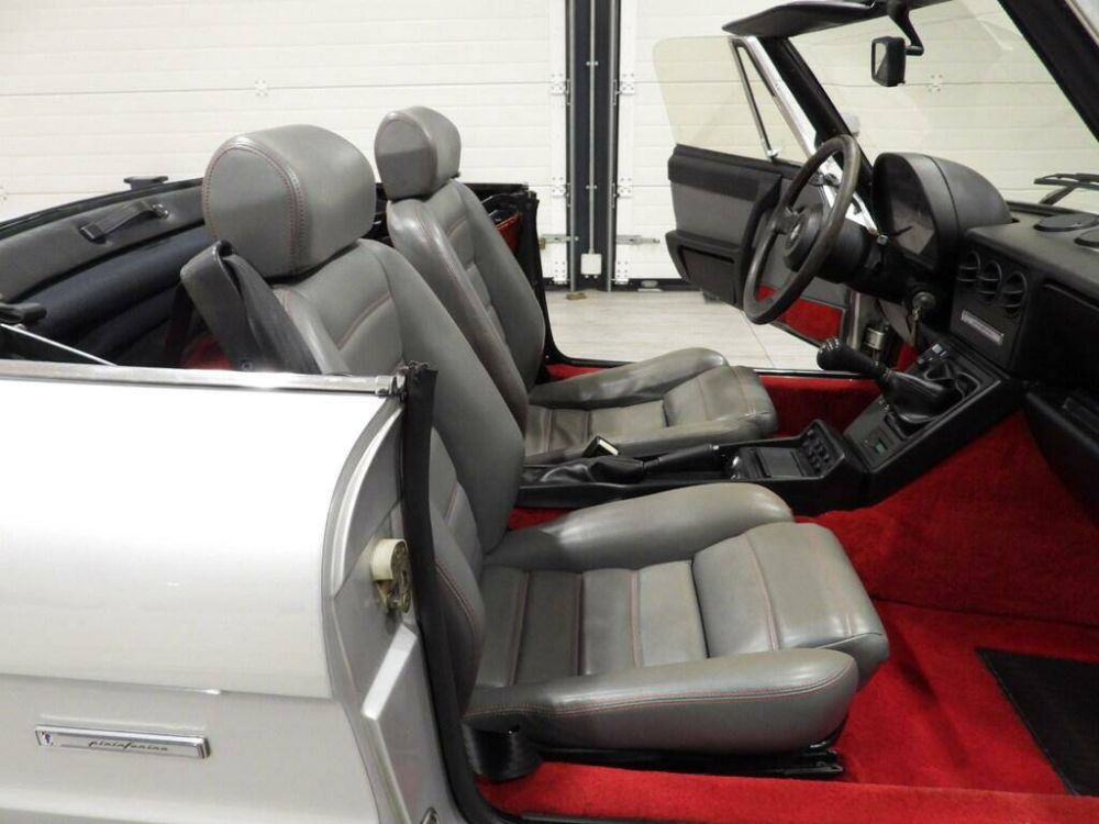 Sedili e pannelli in Tex Alfa sky grigio piombo con cuciture rosse, Cinture di sicurezza, Moquette in lana rossa al pavimento, Volante Alfa romeo originale in pelle a tre razze, Vetri elettrici, Doppio specchio esterno in tinta carrozzeria a regolazione elettrica, 5 Cerchi in lega a 12 fori Alfa Romeo accessorio dell’epoca con pneumatici 195/60 R15, Capotte in tela verde