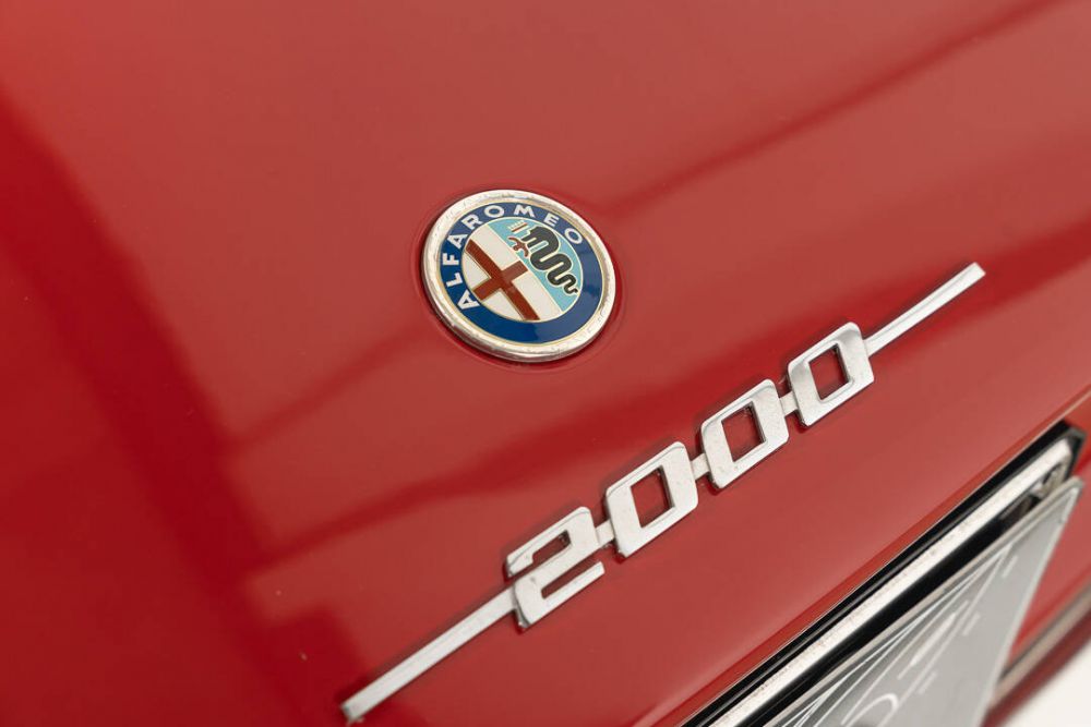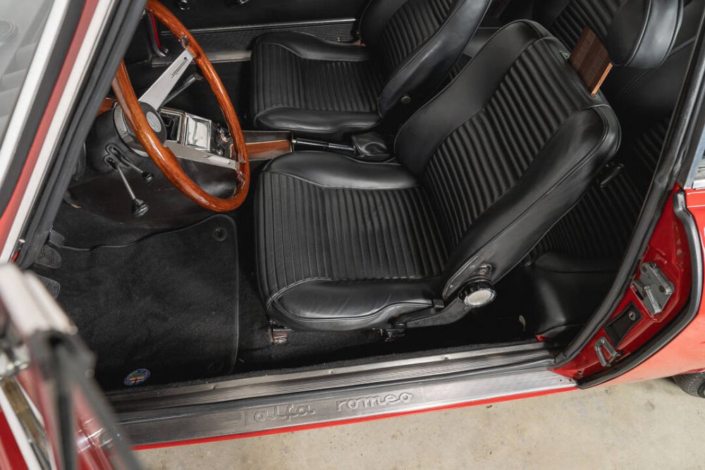 Binnenin werd het interieur met evenveel zorg behandeld, met prachtig zwart leer dat de originele stoelen en deels houten dashboard omhulde, samen met een ongerepte hemelbekleding die de authentieke uitstraling behield. Het kenmerkende ‘Rosso Alfa (Alfa Rood) werd opnieuw aangebracht, terwijl de roestvrijstalen bumpers en het perfect onderhouden chroom een glansrijk contrast boden. Elk onderdeel van de auto, van de tank tot aan de kleinste chromen details, werd met zorg behandeld en in originele staat gehouden, waardoor de Alfa Romeo zijn tijdloze schoonheid en karakter behield.
