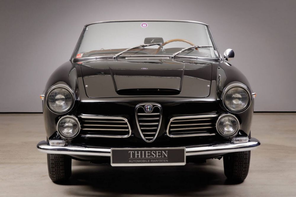 According to confirmation from the Alfa Romeo archives, the Spider offered here with bodywork from Touring was delivered to Kuwait on 1 April 1963. The car later came to South Africa before being sold to Germany a few years ago. According to the available photo documentation, the Spider was extensively restored a few years ago. The car was stripped down to the bare bodyshell and then reworked in all assemblies. Among other things, the vehicle was converted to Weber carburettors. The car impresses with its elaborate and well-documented restoration.