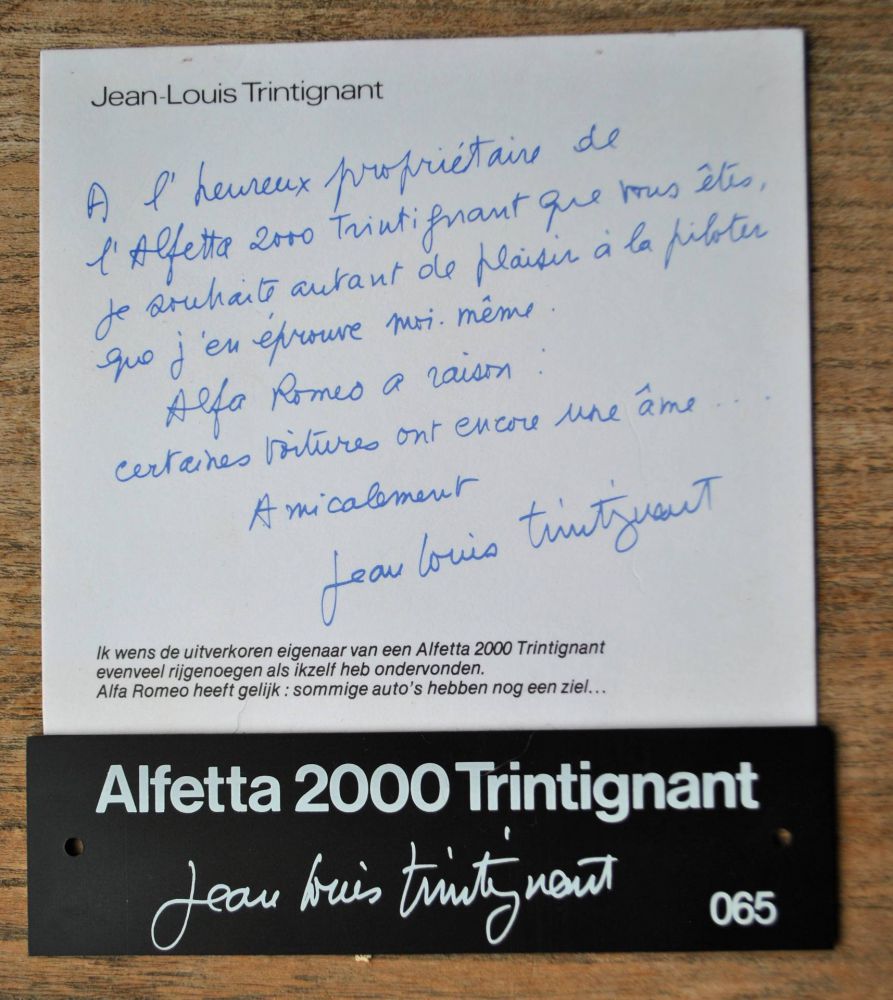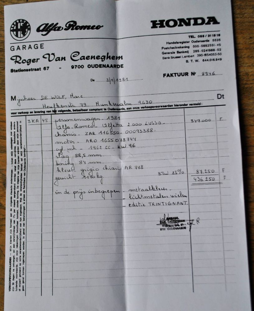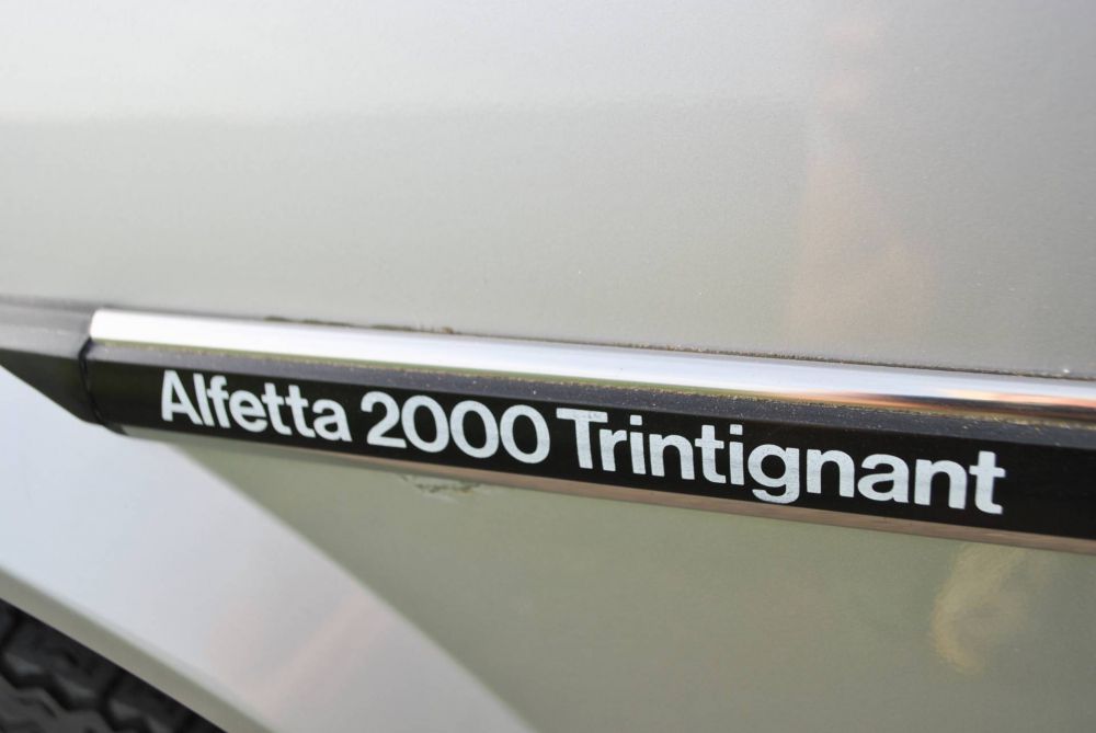 Alfa Romeo Alfetta 2000 Trintignant, année de construction 14 janvier 1981, 20 004 km, Argent métallisé avec sellerie en tissu gris. Version unique, en bel état d'origine ! Voiture belge, du premier propriétaire. Version limitée : numéro 65 sur 100 ! Plaque avec signature et numéro 65 détachés de la voiture, ainsi qu'un message personnel de Jean Louis Trintignant sur une carte. Jean Louis Trintignant était un acteur et pilote de rallye français. Transmission manuelle, version Trintignant, version Lusso, phares ronds, vitres teintées marron (unique), radio, levier et tableau de bord en bois et jantes Alfa d'origine 15 pouces. Des travaux d'entretien majeurs ont été effectués récemment. Il s'agit d'un moteur essence 4 cylindres de 2,0 litres développant 130 ch (96 KW). Poids : 1 110 kg. Vitesse de pointe km/h et en quelques secondes jusqu'à 100 km/h. Exempt de taxe de circulation.