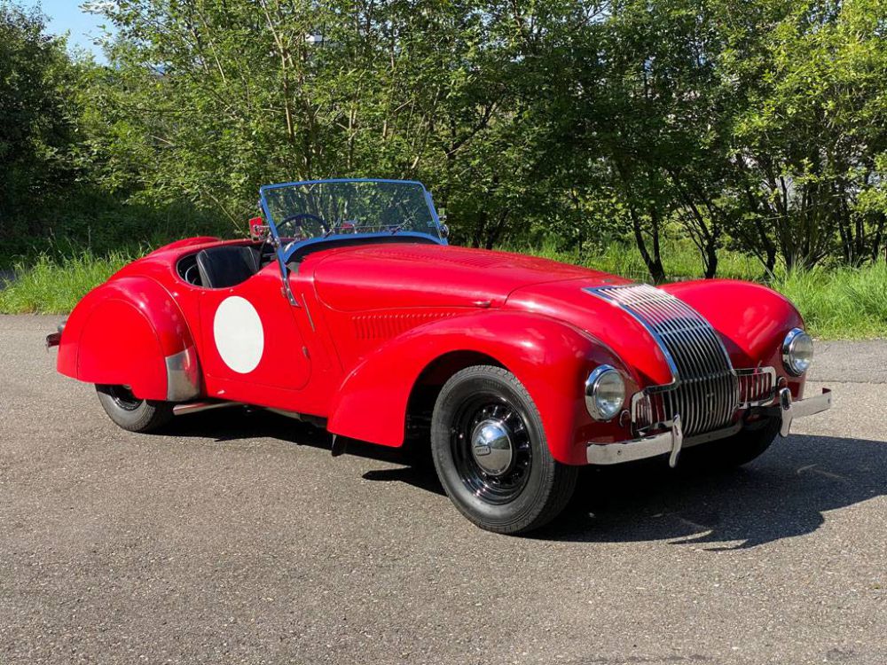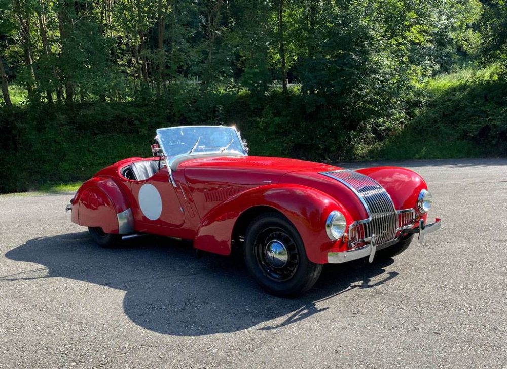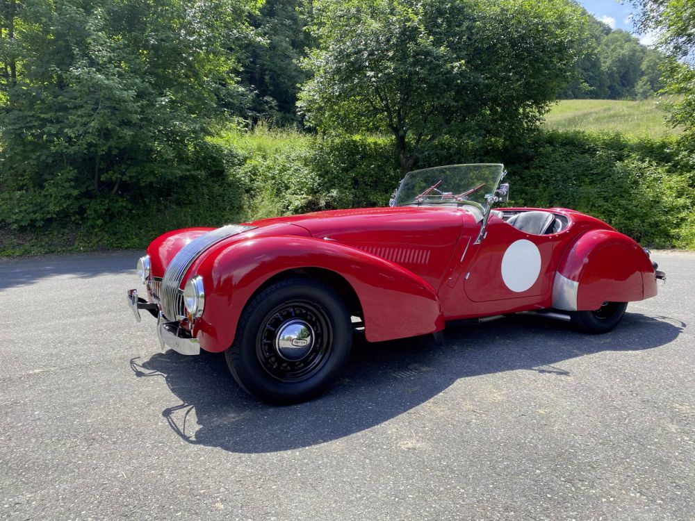 ** -  Fahrzeug hat erfolgreich an der Rally Monte-Carlo teilgenommen /  und anderen Rallys !  -  Seltenes englisches Fahrzeug   -  Fahrzeug wurde restauriert   -  Flathead-Motor   -  gültiger FIVA Pass   -  originale Bedienungsanleitung von 1948   -  originaler Fahrzeugbrief von 1948   -  3-große Ordner über Restauration und Unterlagen, inklsv. CD-Aufnahmen   -  registriert im Allard Ownersclub   -  Schweizer Papiere / MFK - Deutsche Papiere H-Zulsg. und GB Papiere  .......Was man nicht sieht, aber Tatsache ist, dass dieser Allard unglaublichen Fahrspass schenkt. Spurtreue, einfach zu fahren, spritzig und wendig und der Ton des Motors ist schlichtweg betörend. Abgesehen davon ist es ein Fahrzeug, dass man wirklich selten antrifft, ein echter Hingucker. Der K1 ähnelte dem zeitgenössischen Rennwagenmodell J1, mit dem es auch den Antriebsstrang und das Fahrwerk teilte. Allerdings hatte der Wagen einen um 152 mm größeren Radstand und einen etwas höher verdichteten Motor mit etwas höherer Leistung. Im Unterschied zum J1 besaß der K1 auch vordere Stoßfänger und eine andere Dachkonstruktion. Die Vorderräder waren einzeln aufgehängt und hatten eine Querblattfeder. Die angetriebenen Hinterräder hingen an einer Starrachse, die ebenfalls an einer Querblattfeder aufgehängt war. Der Radstand betrug 2692 mm, die Spur vorne/hinten 1422 mm.[1] Der Rahmen bestand aus Stahlrohren, die Karosserie aus Aluminium. Die Produktion begann bereits 1936 mit dem Modell „Special“ in geringsten Stückzahlen. In weitere renntüchtige Einzelstücke wurden amerikanische V8-Motoren eingebaut. Nach dem Ende des Zweiten Weltkriegs übernahm Allard die Räumlichkeiten des Karosserieherstellers Southern Motor Company in Clapham. Im Jahre 1946 wurde der Rennroadster J.1 vorgestellt. Es folgte der komfortablere K.1 und später die Viersitzer L und M. Inzahlungnahme -oder Eintausch gerne möglich.**