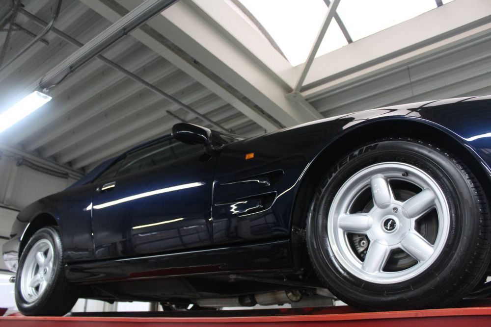 The Virage you see here is from 1994, a very late example, which means that the Porsche Nachtblau convertible is equipped with the modern four-speed automatic available until 1993.
