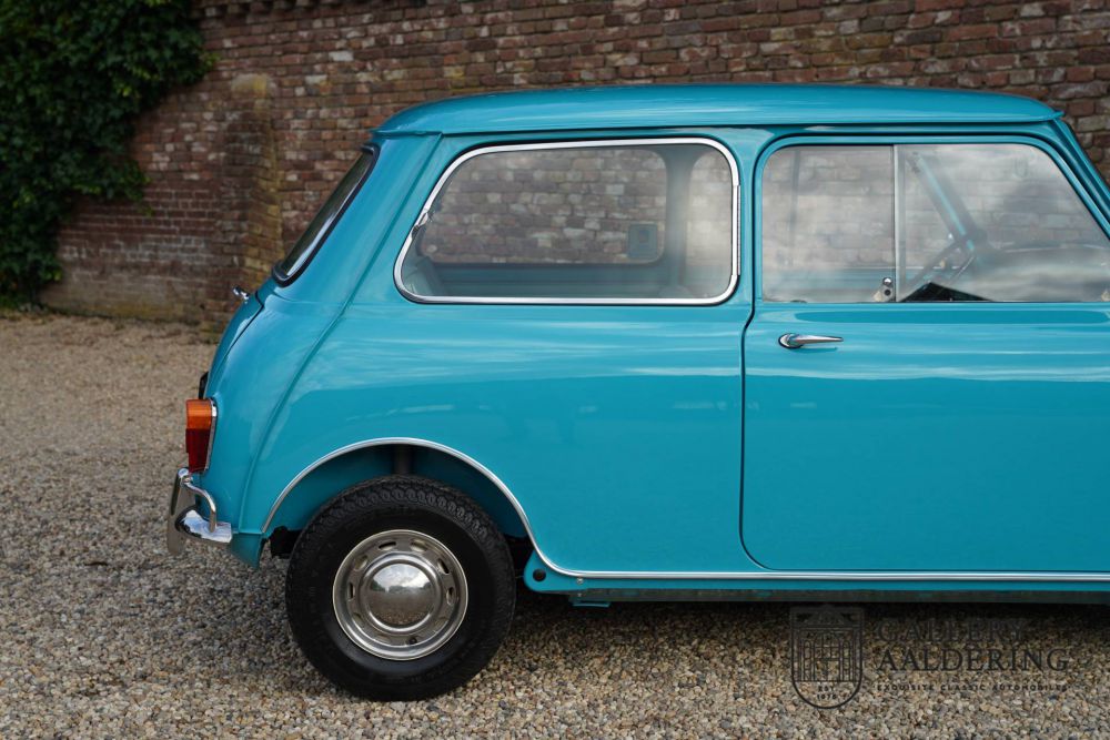 This beautiful Gulf blue Austin Mini De Luxe left the factory in January 1964 and went straight to France. There the car was eventually completely and very professionally restored. The restoration was so professional that he made it to the Swedish car magazines with the Mini. An extensive restoration which, years later, can still be determined to have been expertly carried out. The paint is still beautiful, and measures these wonderful values. In addition, the body and underside of the Mini are in very good condition.