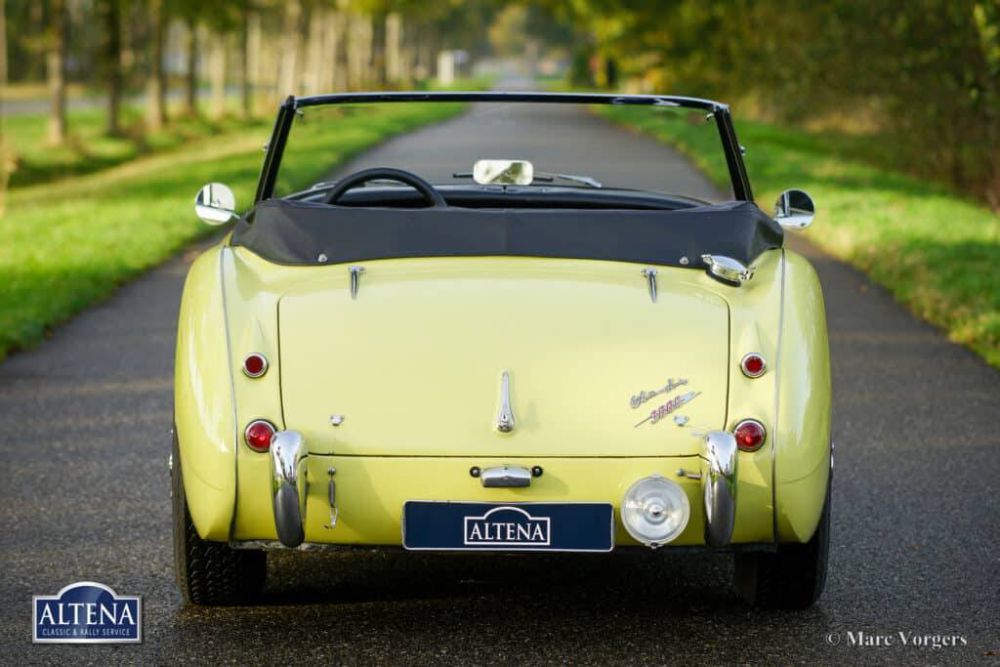 Austin Healey 3000 Mk IIa, year 1963. Colour Primrose (Sunburst) yellow combined with a black interior trimmed with pale yellow piping and black carpet. This wonderful ‘Big Healey’ was sold new in the USA, in April 1999 the car was imported to the Netherlands. In 1999 – 2001 the car was extensively restored, overhauled and prepared for fast road use. A large part of the work was carried out by Altena Classic Service. This fine Healey is in a very good condition, the car looks fantastic and the car drives perfectly! The (service) history of the last 25 years is known and documented. Over the last six years the car has been punctually serviced by Altena Classic Service. This Austin Healey features Minilite alloy wheels, overdrive, 185 / 15 Vredestein Sprint Classic tyres, 7-inch Lucas wide beam cornering / fog lights, Lucas reversing lamp, quick-locks on the bonnet and boot-lid, vented disc-brakes at the front, cooling vents in the front wings and a side exhaust. The car comes complete with its original bumpers, exhaust and original steering wheel! This powerful and very sporty Healey is ready for any new road-trip / adventure in the hands of a new owner!