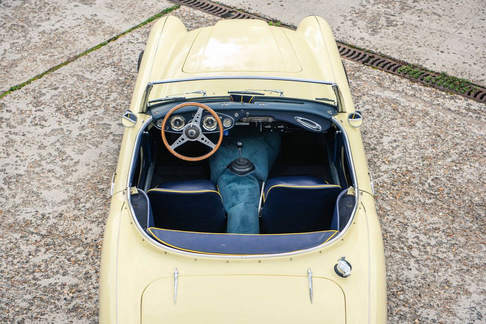 The stunning Primrose (Sunburst) yellow body color comes to life beautifully in the sunlight and, after a very high-quality repaint several years ago, still retains its luster as if new. The blue leather seats, with matching yellow stitching, have also been reupholstered with the utmost care and therefore complete the picture
