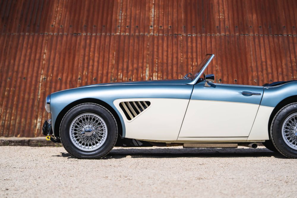 In 2017, the safety harnesses were replaced with inertia-reel seatbelts, and the following year the front seats were retrimmed. The final touch came in 2020, when Hexagon Classics resprayed the Healey in the striking two-tone colour scheme of Ice Blue metallic over Old English White.