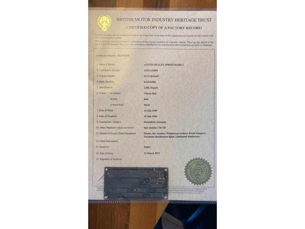 Chassis number AN5-L/43654 nameplate is present along with the heritage certificate.