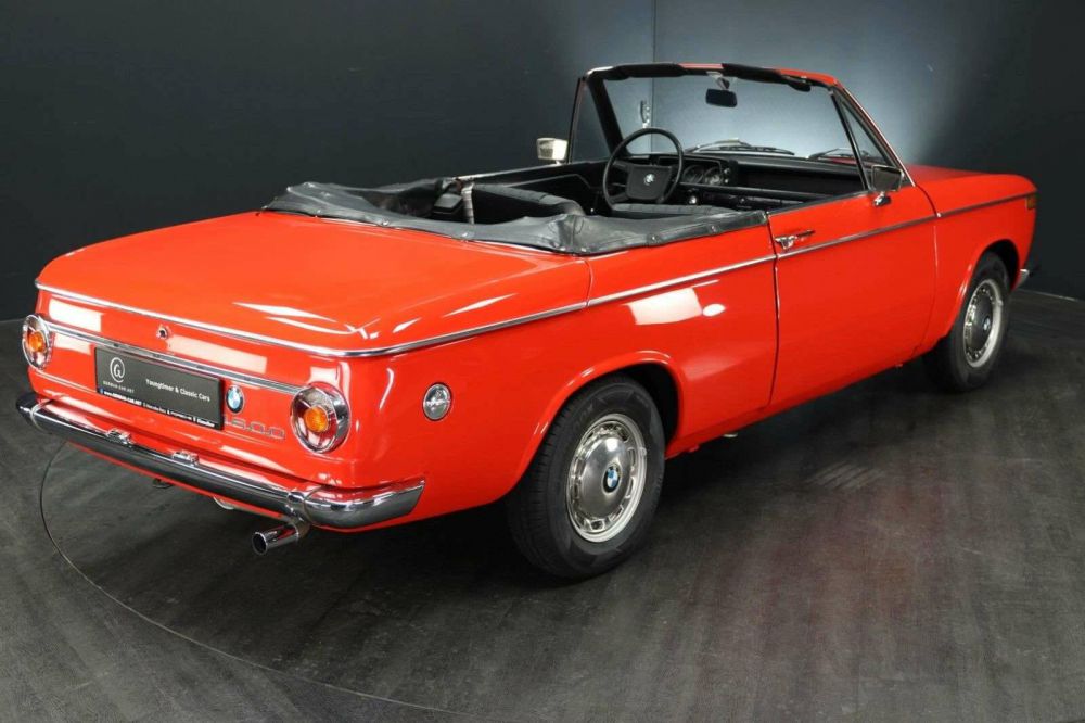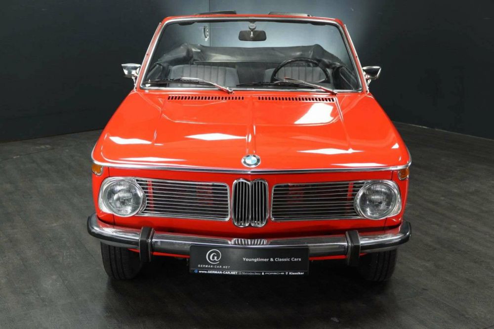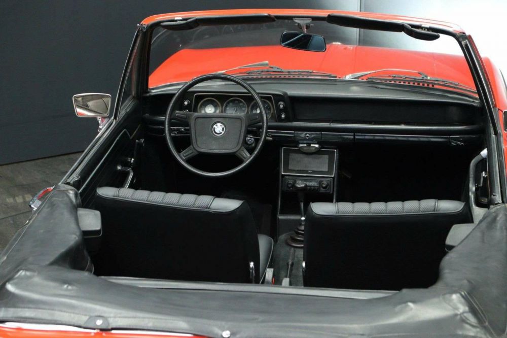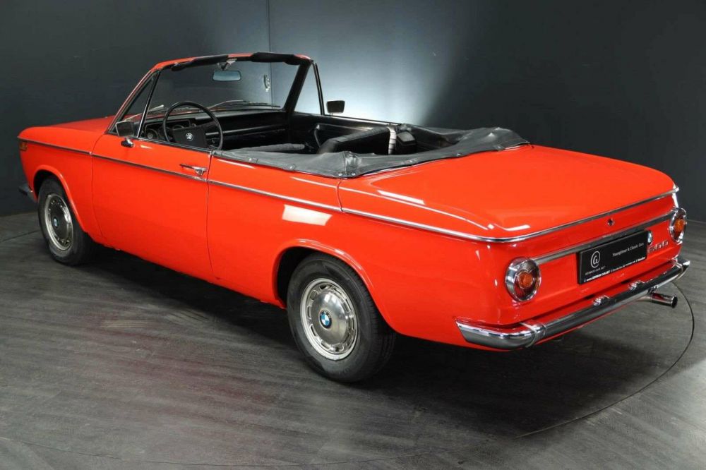 Eines von 1662 gebauten BMW 1600/02 Vollcabriolets, in typischer Farbekombination der 70Jahre: Orange-rot mit Polsterung und Softtop in schwarz.