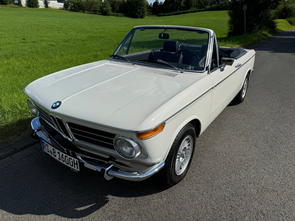 BMW 1600-02 Cabrio Dieses wunderschöne Fahrzeug wurde am 16. Juni 1971 erstmals zum Straßenverkehr zugelassen. Es handelt sich somit um eines der zuletzt gebauten Fahrzeuge von insgesamt 1682 original Werkcabrios, von denen jedoch aufgrund der seinerzeit schlechten Rostvorsorge nur sehr wenige überlebt haben. Die letzte bekannte Zulassung vor der umfangreichen Restauration erfolgte am 26. April 1990 im Kreis Neuss. Leider wurde dabei - wie damals vorgeschrieben – der ursprüngliche Fahrzeugbrief eingezogen und vernichtet. Später wurde das Fahrzeug stillgelegt. Das genaue Datum ist nicht bekannt. Der Fahrzeugbrief aus dem Jahr 1990 ist noch vorhanden. Das Cabrio wurde ca. 2010 in desolatem Zustand von einem renommierten Porsche-Händler aus Nordrhein-Westfalen erworben und an einen Restaurationsbetrieb übergeben, mit dem der Händler bereits beste Erfahrungen gemacht hatte aufgrund vorheriger 911er-Restaurationen. Das Fahrzeug wurde vollständig zerlegt und alle beschädigten Karosserie-, Technik- und Elektrikteile durch Originalteile (soweit erhältlich) ersetzt. Anschließend erhielt der Wagen eine mehrschichtige Lackierung in der Originalfarbe „chamonix-weiß“. Die Inneneinrichtung wurde in schwarzem Leder ausgeführt. Auf Wunsch des Auftraggebers wurden abweichend vom Original ein Instrumententräger des Nachfolgemodells (ab Baujahr 1973) eingebaut. Der entsprechende original Instrumententräger ist aber vorhanden. Die Restauration wurde im Jahr 2013 abgeschlossen. Das Fahrzeug wurde danach jedoch nicht zugelassen, sondern insgesamt über ca. 1500 Kilometer ausschließlich mit roter Nummer bewegt. Im August 2018 erwarb dann der jetzige Besitzer dieses Cabriolet. Nach erneuter Abnahme für ein H-Kennzeichen erfolgte die letzte Zulassung am 29. August 2018. Bis zum heutigen Tage wurde der Wagen nur bei schönem Wetter bewegt, und zwar lediglich ca. 1200 Kilometer. Dieses Jahr wurde wegen Kratzer die Windschutzscheibe mit Dichtung ausgetauscht und die Bremssättel inklusive der Bremsscheiben erneuert.