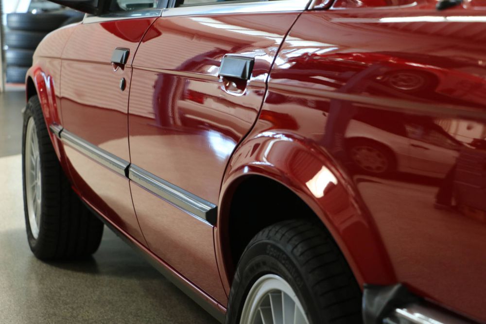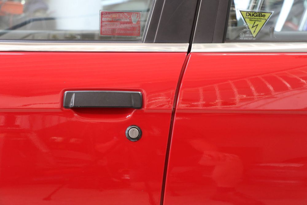 Die Lackierung im Farbton zinnoberrot steht dem E30 ausgezeichnet und kontrastiert hervorragend mit dem Chrom an Scheibenrahmen und Stoßfängern. Der Lack ist original und noch immer hochglänzend! Es finden sich keinerlei Spuren von Anrostungen oder Beschädigungen Dank gewissenhafter Pflege und sorgsamer Behandlung.