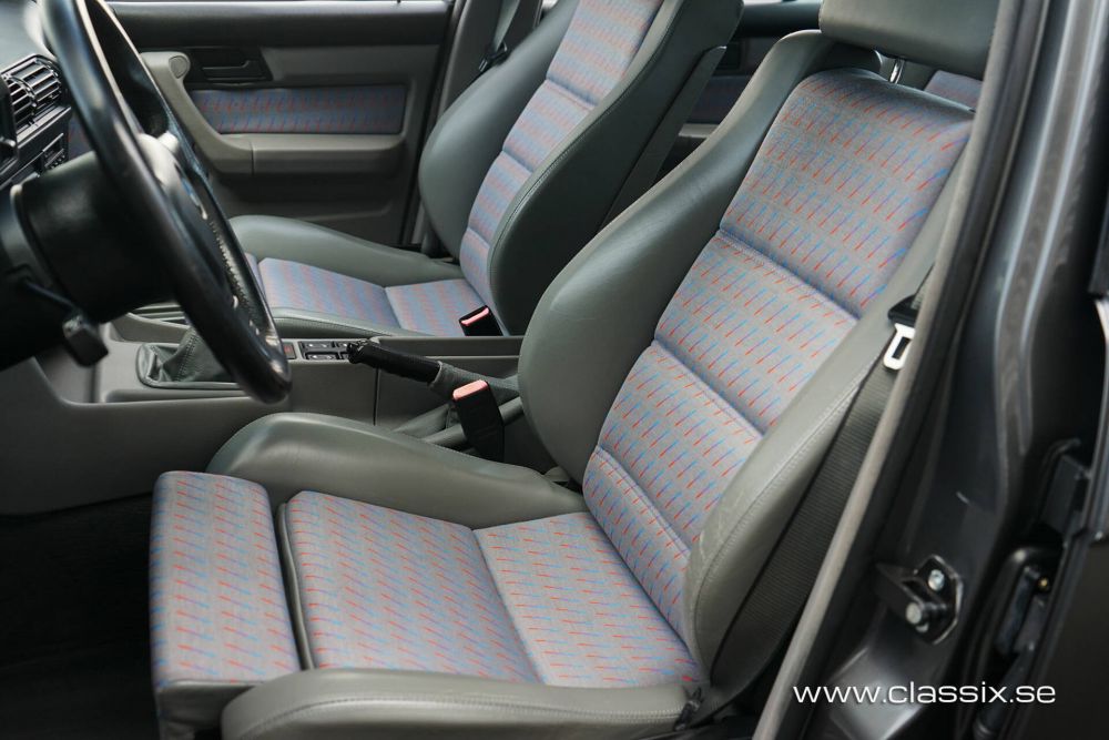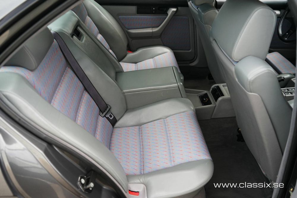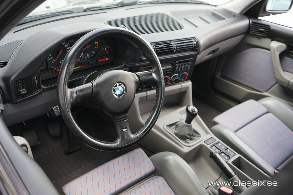 Exterior: The exterior of this BMW E34 M5 is immediately set apart by its unique and period-appropriate turbine wheels. These wheels were seen on the early E34 M5 models and are highly desirable today. The car was delivered in the color Sebringgrau Metallic, a color that gives this large saloon a very elegant look. The car's paintwork is nice but not flawless, the body however shows no signs of corrosion. Another feature setting this E34 M5 apart is its factory-equipped rear spoiler, adding balance to the shape of the car.