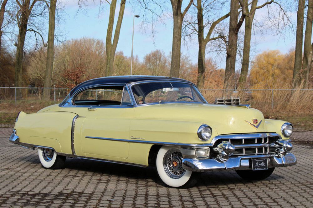 One of the most beautiful Cadillac models ever, the 1953 Coupe de Ville! This example is originally from California. Very cool body and frame. Beautiful paintwork in the color combination of ‘Artisan Ochre’ lower & ‘Ebony’ upper. The chrome work is truly beautiful, just like the stainless steel moldings. Correct interior with ‘Lt Green Tapestry Pattern Cloth’ & ‘Dk Green Leather’. This is a real Coupe de Ville (53-6237DX) with the luxurious interior and electric windows as standard. Of course equipped with the 210 hp 331 cu.i. V-8 with a 4-speed Hydra-Matic automatic. With power brakes and power steering, it is truly a comfortable cruiser as one would expect from a Cadillac. As a nice extra, this Coupe de Ville has chrome spoke rims!