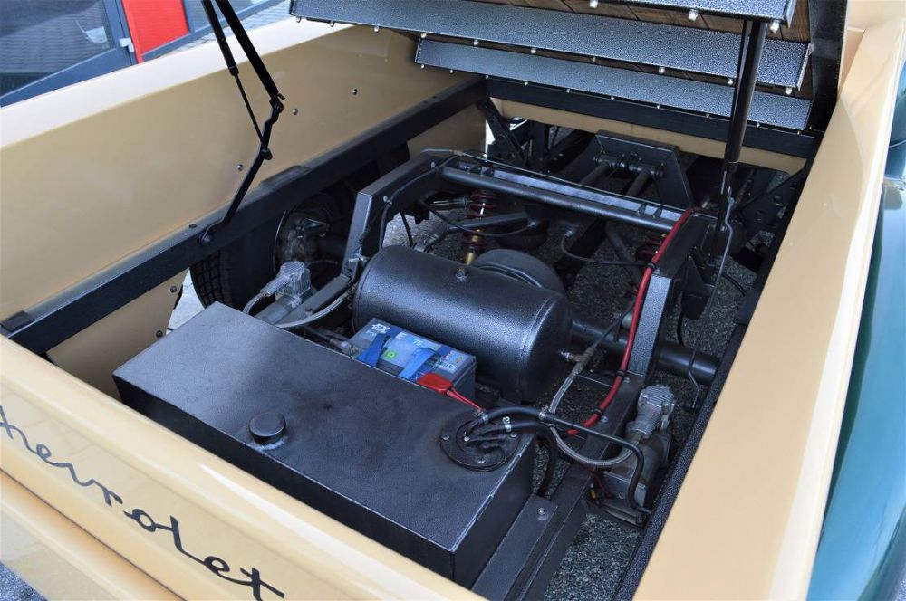 Der Rahmen ist ein Spezial-Anfertigung mit 4- Link Aufhängung der Hinterachse inkl. Panhard-Stab, Gewinde-Fahrwerk und unterstützender Luftfederung. Die Vorderachse ist eine Einzelrad-Aufhängung aus der GM - Full-Size Palette und wurde ebenfalls mit einem Gewinde-Fahrwerk aufgewertet.