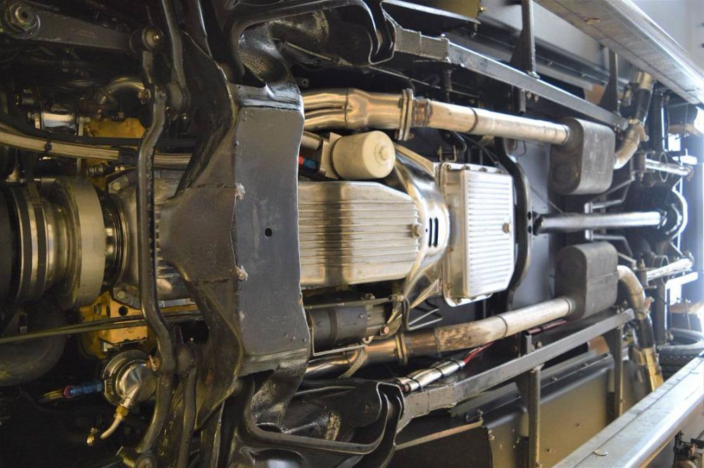 Der Rahmen, die spektakuläre 4-Linnk Aufhängung sowie die 9 Zoll Ford Hinterachse sind gut zu sehen und können durch aufklappen der Ladefläche auch gezeigt werden.
