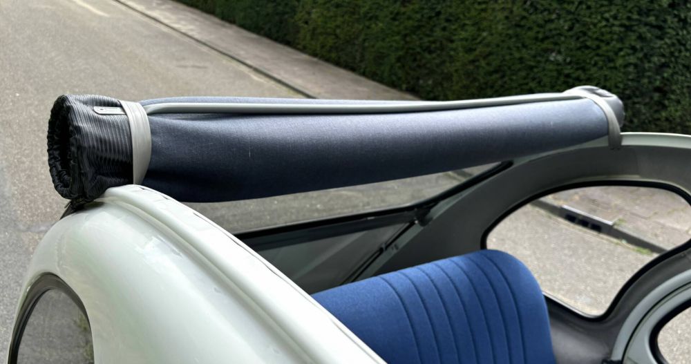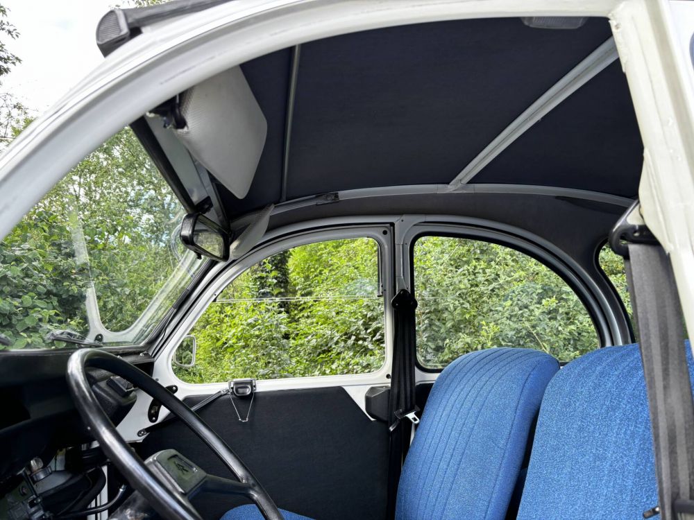 The body has been newly painted in the original beautiful colour Blanc Meije and this is excellently done. The paint looks very nice with almost no signs of use. The duck has new mudguards and new rims. Also new are the beautiful round chrome headlights with yellow lights. The roof has been renewed in the past and the chassis galvanised. All sound and solid. So the exterior is very nice and tightly painted. Also notable is that the doors close like a safe, so a lot of time has been put into the right finish.