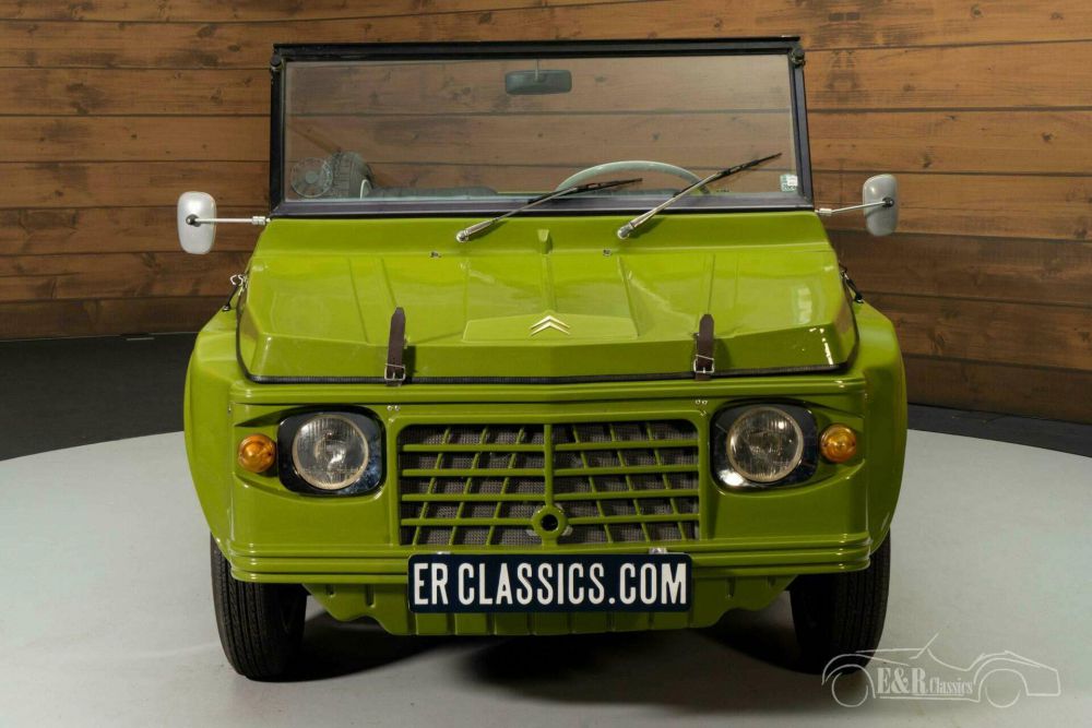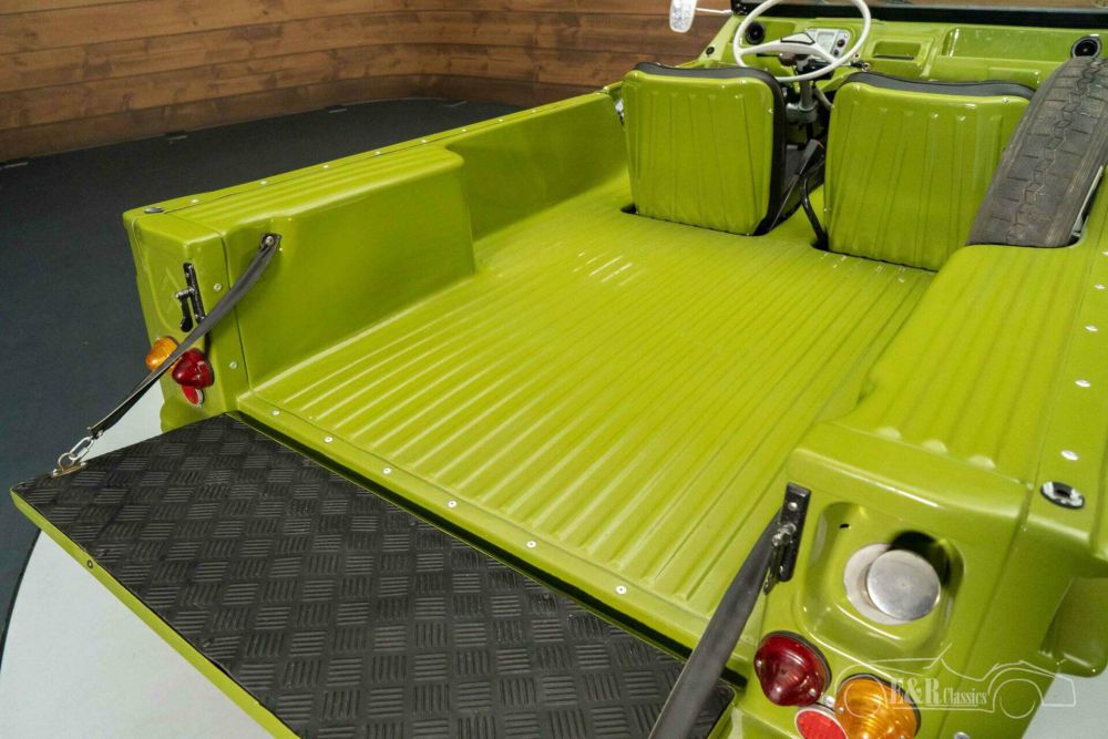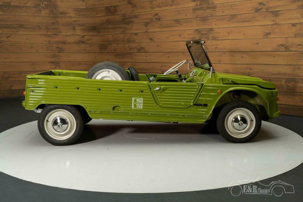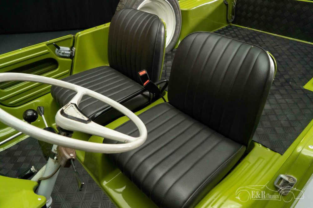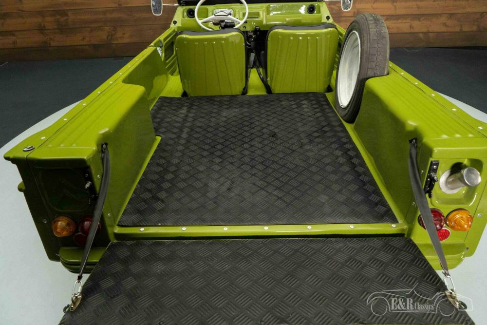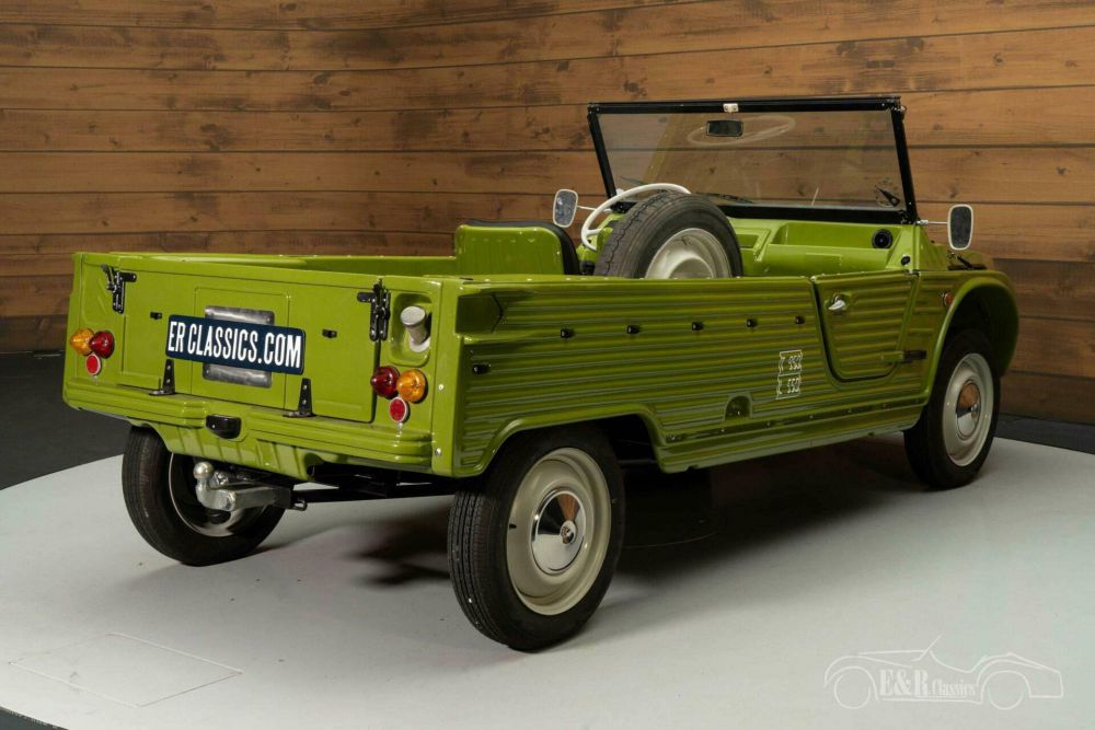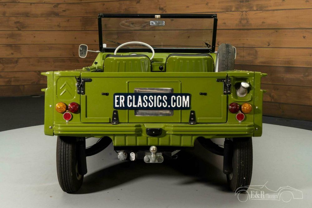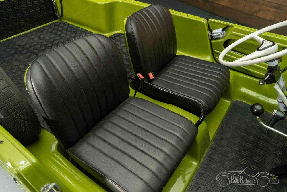 The Citroën Mehari that we offer for sale here is truly a sight to behold. It has a beautiful dark green paint that completely matches the looks of this French classic. It comes with a matching dark green vinyl soft top that has windows all around. The interior is equipped with black comfortable artificial leather seats. The Citroën Mehari is available with a matching trailer at an additional cost.