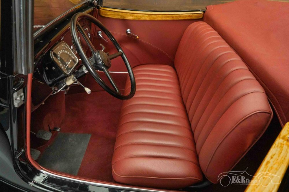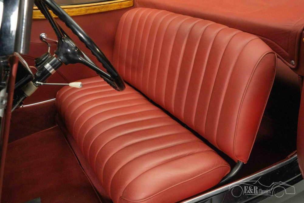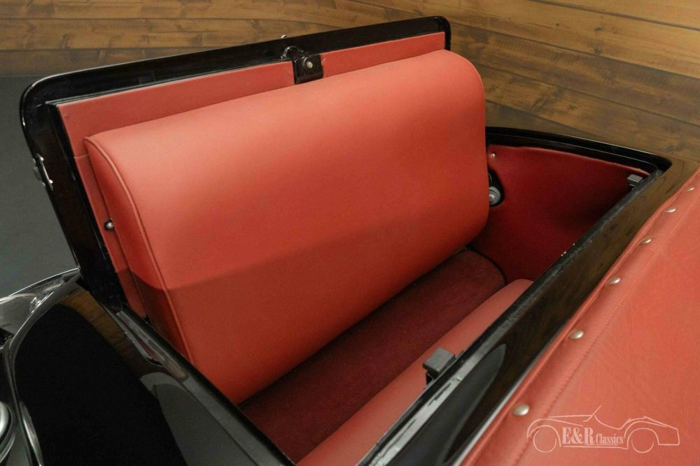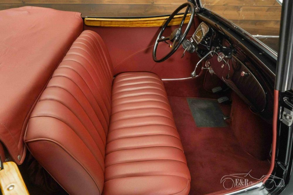 The Citroën Traction Cabriolet that we offer for sale here is finished in a beautiful colour combination. The black paintwork looks great on the classic and makes the chrome pop. The burgundy red leather interior combines very nicely with the black paintwork and the sprayed rims. The Citroën Traction Cabriolet has an original Rumble Seat and a black soft top.