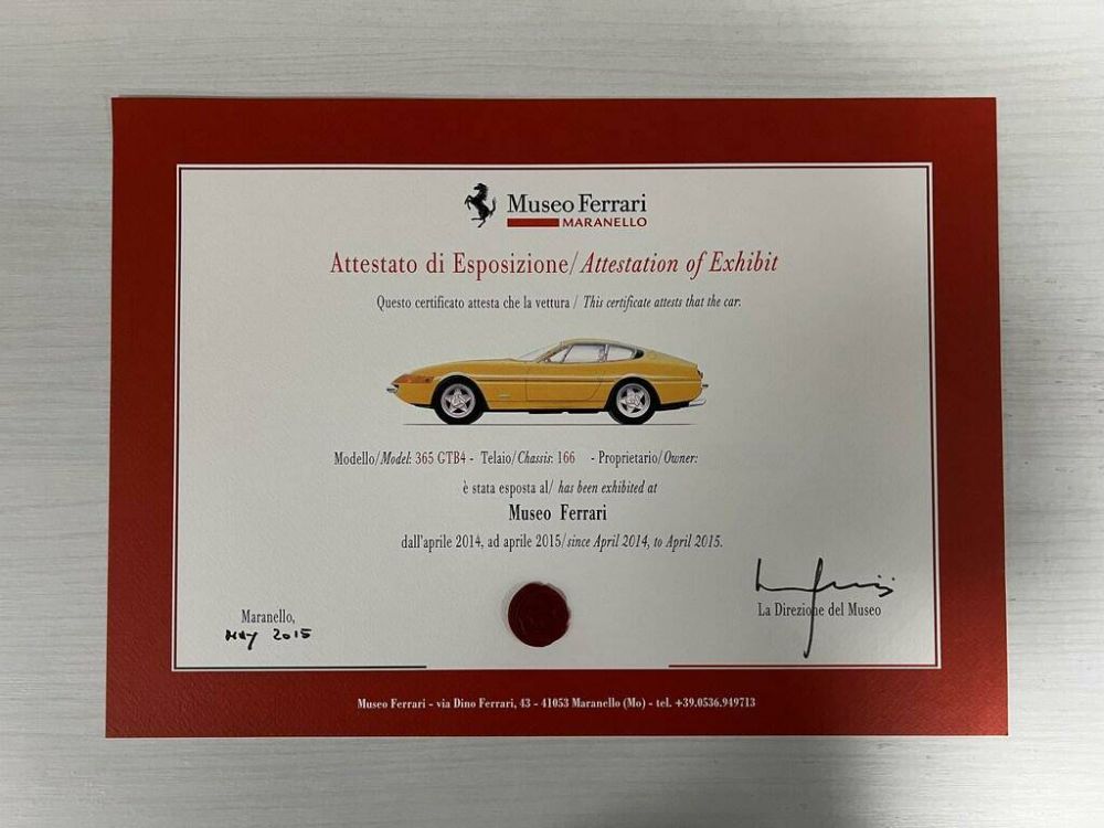 DISPONIBILE ATTESTATO DI ESPOSIZIONE RILASCIATO DA MUSEO FERRARI MARANELLO CHE CERTIFICA LA PRESENZA DELLA VETTURA DALL’APRILE 2014 ALL’APRILE 2015 IN ESPOSIZIONE UFFICIALE