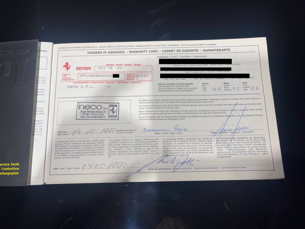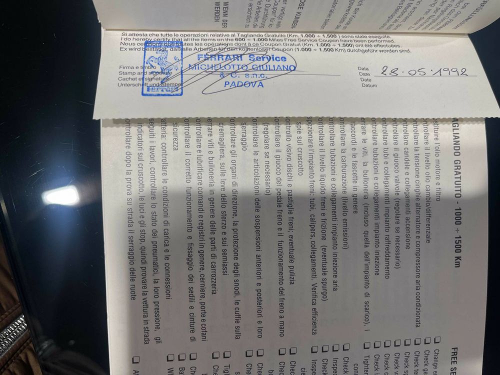 La vettura è sempre rimasta nel territorio italiano, la prima consegna è avvenuta presso Ineco Verona in data 07/05/1992, è disponibile e visibile il corredo d'origine(ilbretto tagliandi ed ulteriori libretti originali) e la valigia strumenti ufficiale Ferrari dell'epoca.