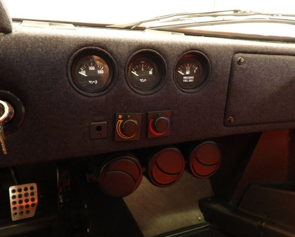 Sedili sportivi in tessuto Vigogna rosso con guscio in Kevlar, Cinture di sicurezza Sabelt TRW rosse a 4 punti, Volante a tre razze con corona in pelle, Aria condizionata, Cerchi in lega Ferrari Speedline con pneumatici Pirelli P-Zero anteriori 245/40 ZR17 e posteriori 335/35 ZR17