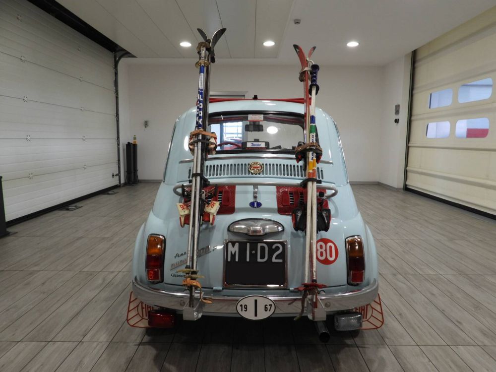 FEATURES FIAT NUOVA 500 F DOLCEVITA: Original interior in sky in red and white in the upper part of the front seats, Openable red hood cover, Original ivory Bakelite steering wheel with stainless steel servo horn (optional at the time) and steering wheel cover in red Vipla with automatic buttons, FIAT 500 emblem on the dashboard, passenger side, VOXON car radio from the time, additional instrumentation with analogue clock, cooling temperature, vintage tachometer, thermos holder (optional from the time ) on the inside of the passenger door, leather strap to secure suitcases with dedicated suitcase, red rubber mats from the period (new), soft document pockets on the doors, MARSCHALL spotlights, reversing light, red rear fog light, FAPA ski holder (bottom of the period) complete with sixties skis including poles, MILLERIGHE spoked alloy wheels with new whitewall tyres, red rubber air intake covers and period mudflaps on the rear wheels.
