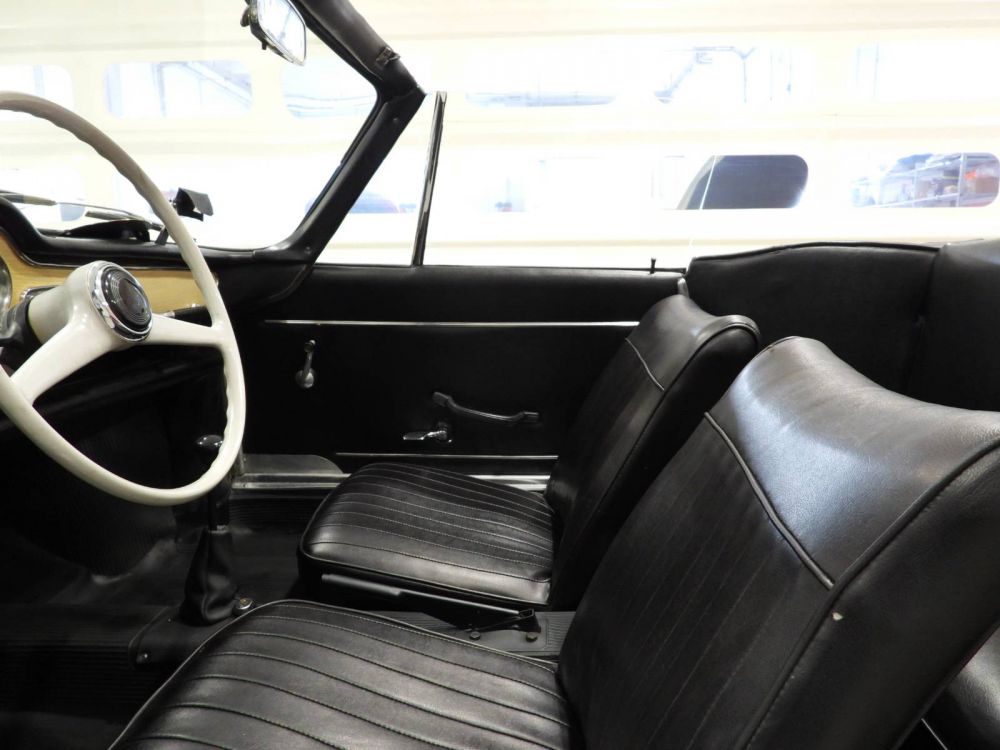Sedili e pannelli in sky nero, Volante a due razze, Cruscotto in legno, Antifurto meccanico con chiave blocco leva cambio accessorio di periodo, Specchio esterno lato guida cromato, Capotte in tela nera, Cerchi a raggi Borrani cromati con gallettone cromato con pneumatici 115/70 R13, Hard top