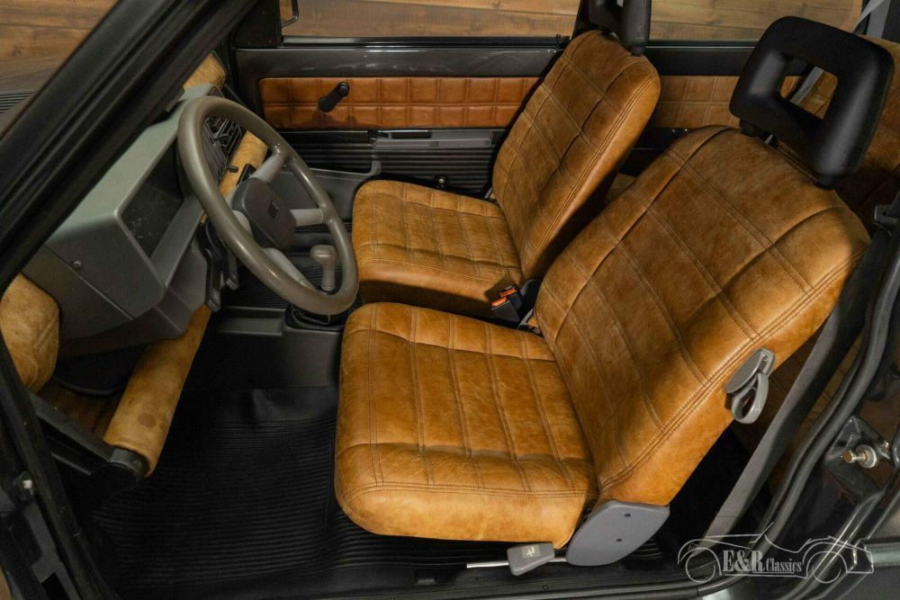 The Fiat Panda 4x4 that we offer for sale here is really a sight to behold. It has a beautiful anthracite-coloured paint, which has recently been renewed. The panda is also equipped with roof racks, white painted wheels, 4x4 stickers and protective grilles around the lighting. The interior of the Panda has also been renewed and equipped with Alcantara brown upholstery that contrasts beautifully with the dark paint.