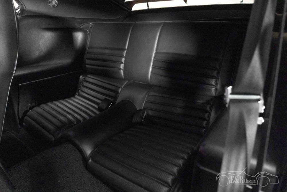 The Ford Mustang Mach 1 Fastback that we offer for sale here is truly a sight to behold. It is finished in the original factory colour Candy Apple Red and has a matte black hood with hood scoop. The dark rear spoiler, rear window louvres and chrome rims complete the overall picture of this American muscle car. The interior of the Mustang is in very good condition and is equipped with black artificial leather upholstery, a dashboard with wood inlay and clock, center console and period-correct radio.