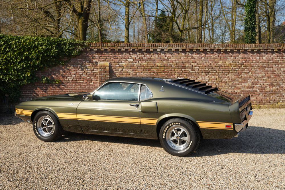 The particularly beautiful specimen you see here is a rare manual Shelby GT500. The car has been completely restored and provided with a beautiful olive green paint. It combines beautifully with the stickers on the flanks. It looks great and the condition of the body does not detract from that: the Shelby has been neatly restored.