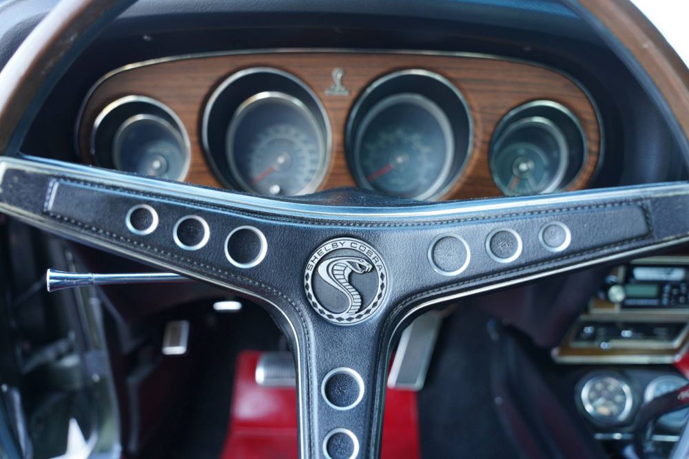 The interior is particularly beautiful, with neat upholstery and very neat carpet. The whole creates a very neat impression. The dashboard, steering wheel, door panels: originality prevails everywhere, with Caroll Shelby's signature on the glove compartment as icing on the cake.