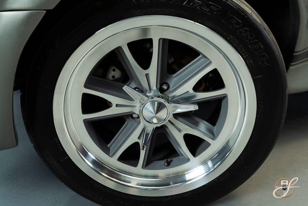 The colour of the body, a beautiful dark grey -Gun Metal-, with two huge black stripes that run all the way across it, together with the five-spoke double-chrome rims, put the finishing touch to a car that has become a cult object for lovers of the seventh art and motor racing.