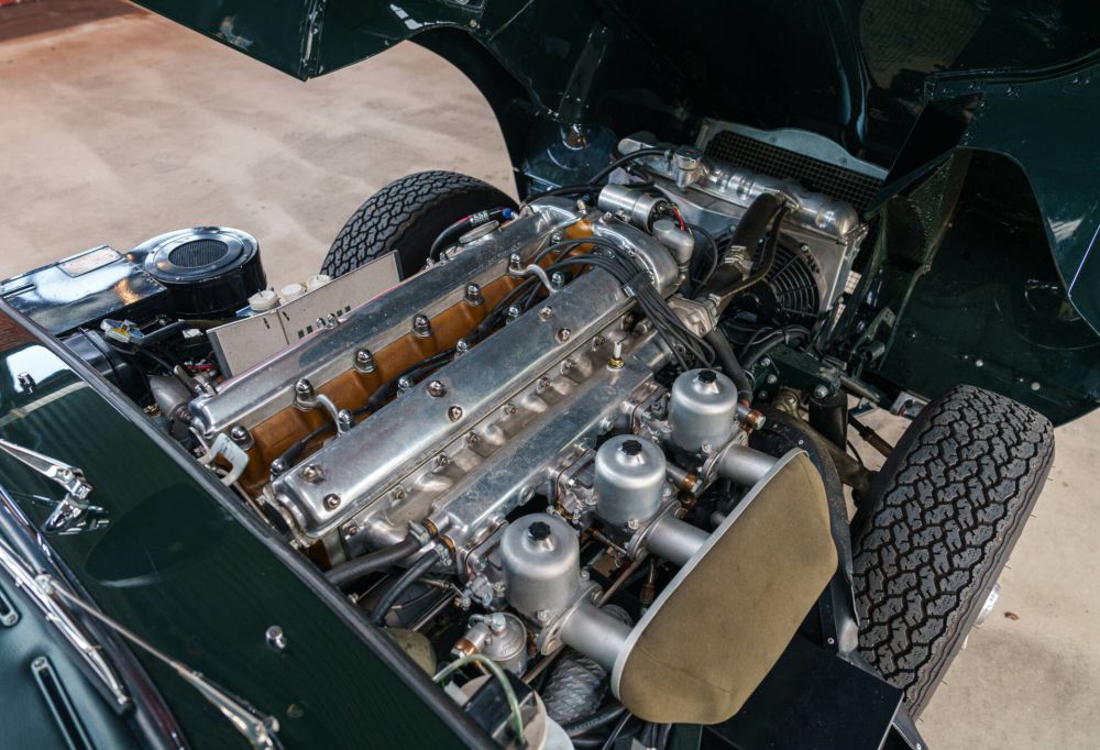 The car’s iconic bodywork, often described as “sculptural,” features the long nose, low stance, and fluid lines that have made the E-Type a design legend. The chrome wire wheels, slender chrome bumpers, and signature headlight design give the car an air of both sophistication and aggression, while the sweeping convertible roof makes it ideal for top-down driving on scenic roads.