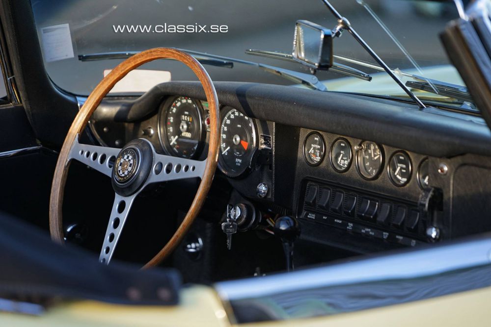 Interior: The Jaguar E-Type's interior presents a simple, clean, and elegant black leather design. While the seats have been reupholstered at some point, they today exhibit a nice worn in aesthetic. As a Series 1.5 E-Type, it combines the timeless exterior of early models with a more comfortable and accommodating interior. The adjustable backrest, a feature not seen in earlier models, adds to the comfort. Being a convertible, it offers easier entry and exit, making it a more accommodating choice, especially for taller individuals. Additionally, the car is equipped with seatbelts for added safety. Other interior details such as gauges, dashboard, and buttons are in good condition.