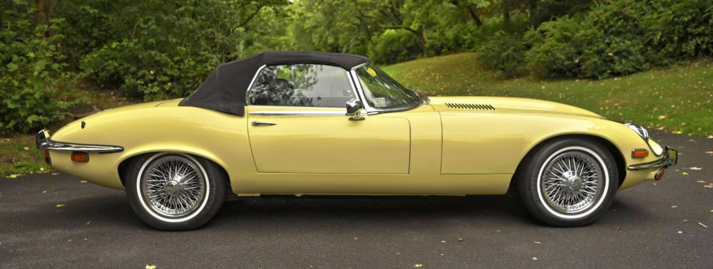1974 Jaguar E type V12 Convertible LHD Auto Vin Number: VEIS25584 Registration Number: TDV56M Originally residing in Puerto Rico where it must have been quite a sight. The car still has its original Puerto Rico window sticker in situ. This V12 E Type was imported by the current owner some few years ago who then set about restoring & improving the car to the beautiful condition we find it in today with just 41,499 miles covered from new. The paint is unmarked Primrose yellow, its original colour. A brand new black leather interior has been fitted. The car was also unsurprisingly fitted from new with Jaguar factory air conditioning which it has to this day. The hood is a brand new mohair item along with a matching hood cover. The car sits on chrome wire wheels shod with new radial tyres. Pleasingly the original book pack & British Leyland Passport to service paperwork comes with the car. There is a mssive bill file with the car showing vast expenditure with all the right people such as SNG Barrat for all the bits reqquired to restore the car. This is a fine car to drive with a smooth silent V12 engine & automatic gear box that changes gear effortlessly. To sum up: this is a very useable sorted & restored car in lovely condition & is absolutley ready for its next owner.