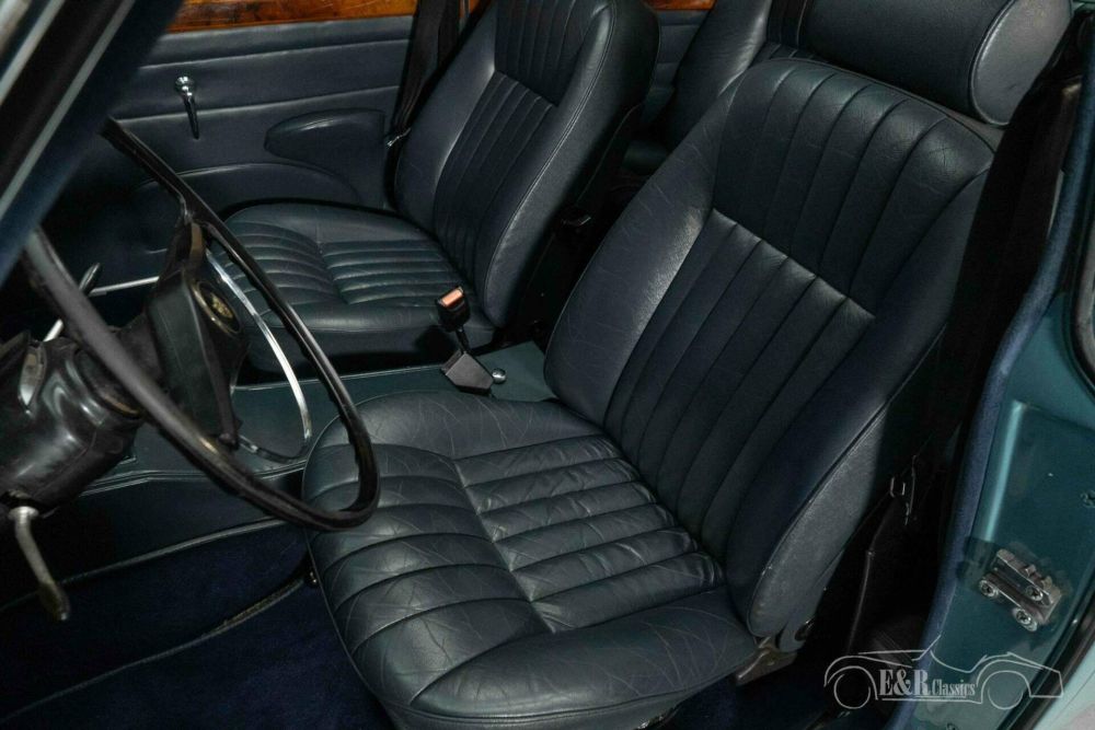 The Jaguar MK2 that we offer for sale here is truly a sight to behold. It is finished in a rare blue paintwork that changes when the sun shines on it. Furthermore, the Jaguar is equipped with a factory-fitted sliding roof so that you can enjoy the outdoors while driving. The interior is in a neat condition and has dark blue leather upholstery with a beautiful wooden dashboard.