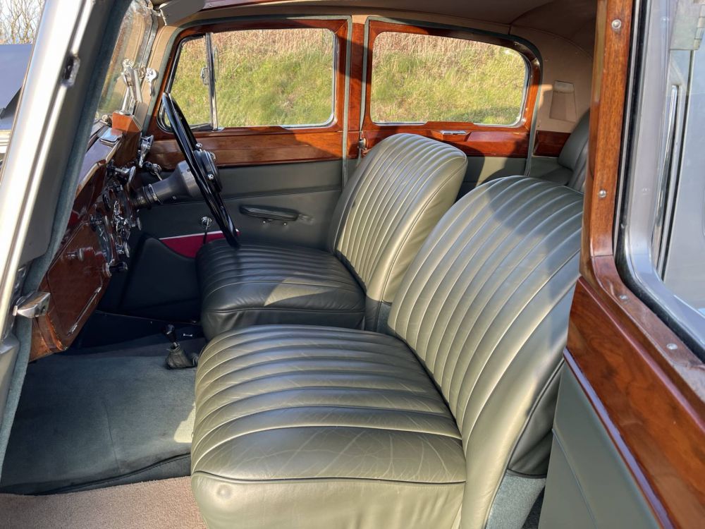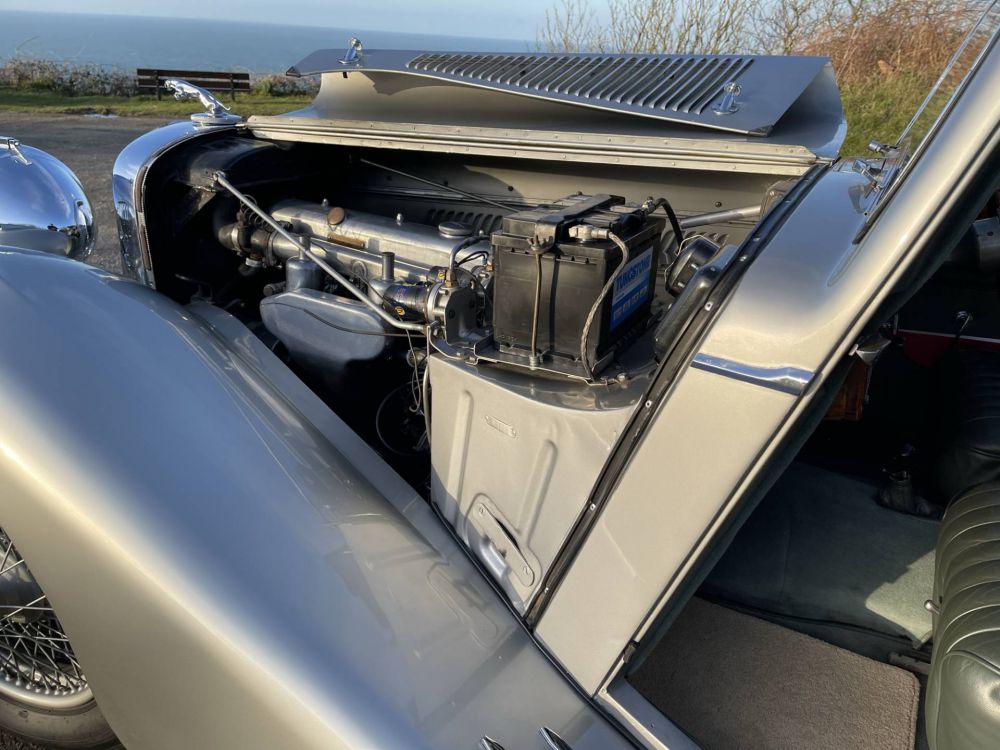 Similarly, the restored bodywork remains in splendid condition having been well looked after, with some additional work on the cars bonnet. It has good chrome and wire wheels. The silver grey paintwork is particularly fine and suits the car’s flowing lines very well. The interior (upholstery, carpets and headlining) was fully re-trimmed as part of the restoration work and remains in excellent condition. The car’s wooden fittings – dash, door cappings etc. – are in very good condition.