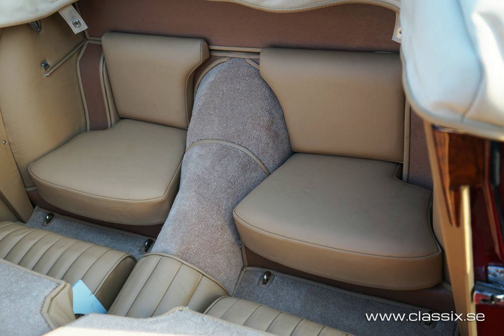 Exterior: This particular Jaguar XK140 is finished in a striking maroon, beautifully complemented by a beige soft top. The car underwent a meticulous restoration around 2019, showcasing flawless bodywork with perfectly aligned panels and even gaps. You will have to look for a long time to find a Jaguar XK140 with better body work than this car. The maroon paintwork gleams in sunlight, giving the vehicle a vibrant, dynamic appearance. The soft top is secured with three buckles and easily folds down, transforming the vehicle into a classic open tourer. Every chrome detail, from the trim to the emblems, has been replaced or restored to the highest standard, enhancing the car's overall appearance. The Jaguar rides on new chrome spoke wheels fitted with Michelin Pilote X tires, regarded as the premier choice for classic cars of this era. Importantly, the undercarriage is just as immaculate as the exterior.