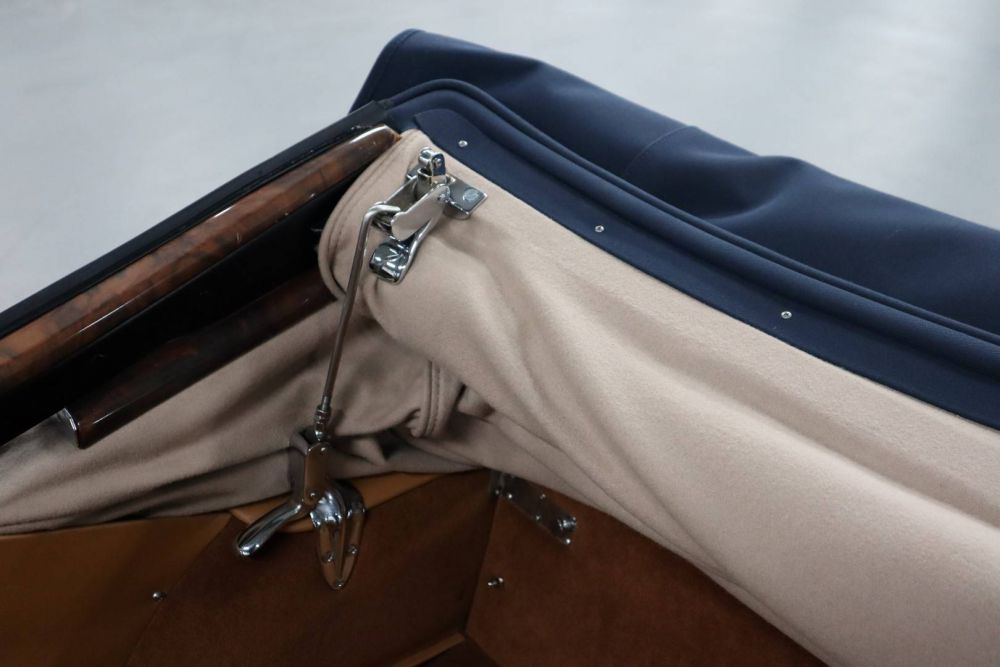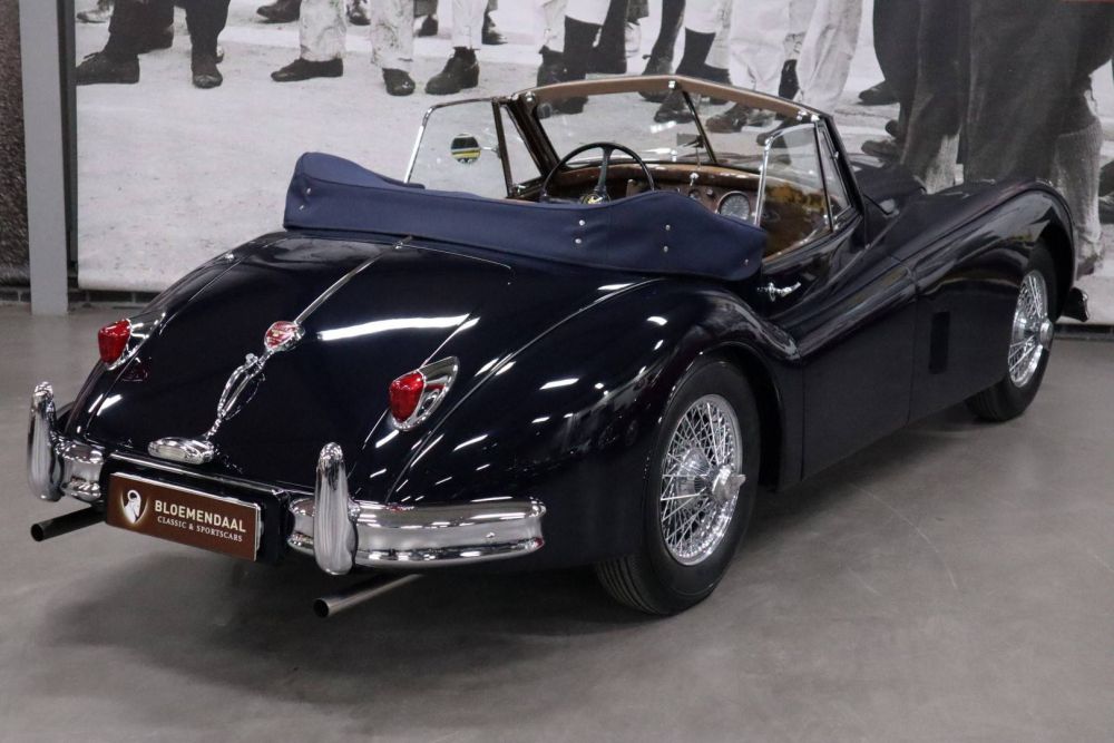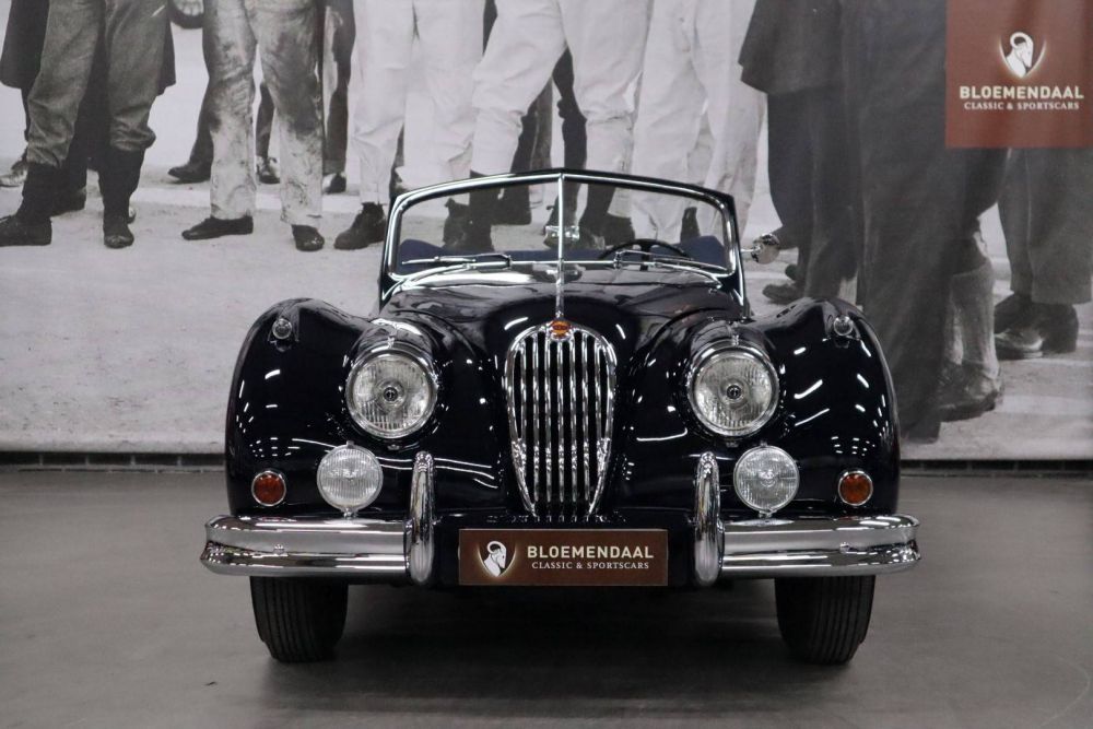 The XK 140 that we now offer is the Drop Head Coupe. So it is equipped with a beautiful, in this case blue, soft top that is very quick and easy to store, after which you can drive in a wonderfully sheltered position, because it has retractable side windows. The interior offers plenty of room for two people, while behind the seats there is an excellent storage space for the extra luggage in case if the large trunk is already full.