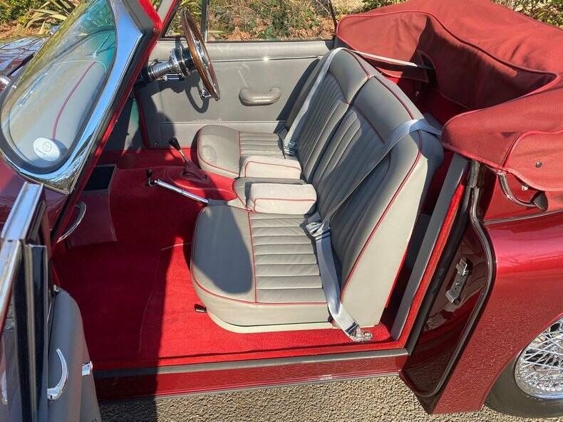 What a cracker this stunning XK is - gleaming metallic burgundy with a glorious burgundy mohair hood and a light grey leather interior piped in burgundy
