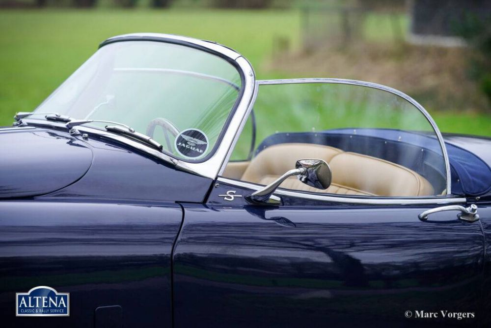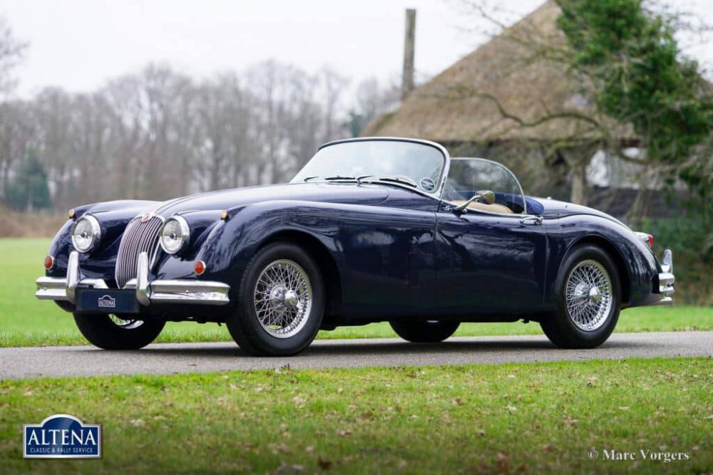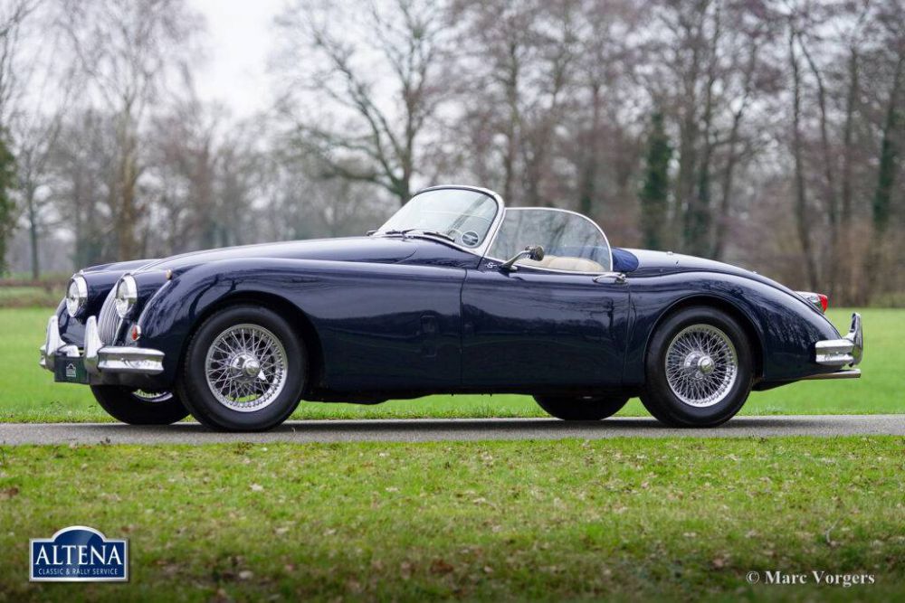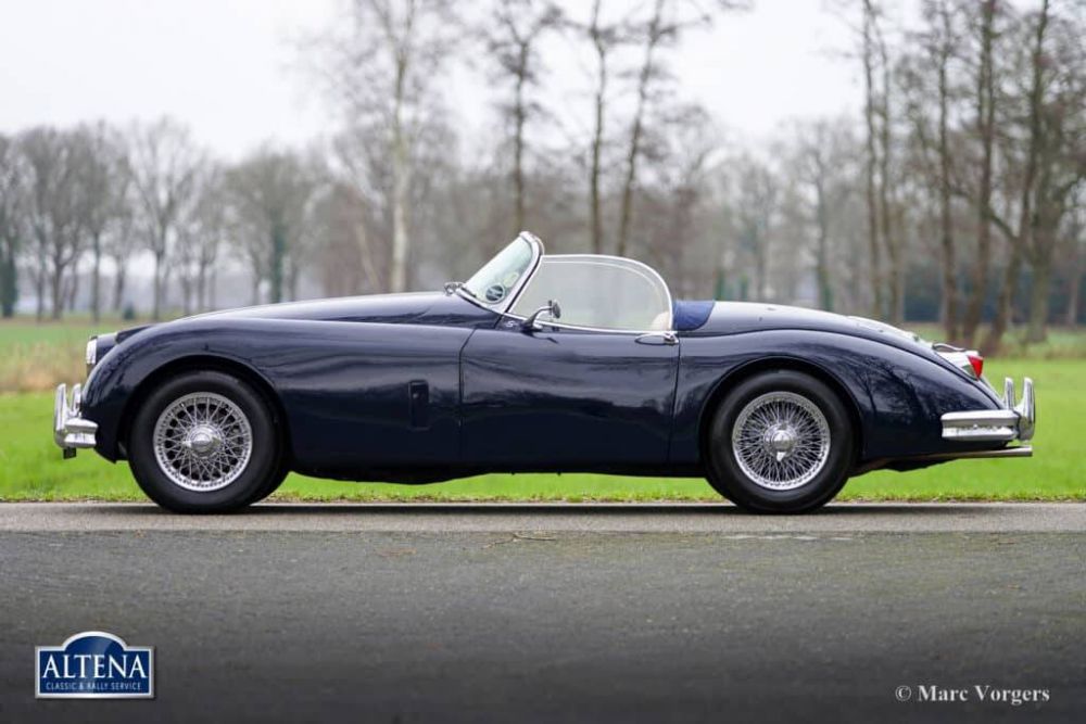 Jaguar XK 150 S OTS Roadster, year 1958. Chassis number S830475DN, engine number VS1047-9, Body number F15493. This is a ‘matching numbers’ factory original XK 150 S model, a Heritage certificate is present to confirm this. Only 844 left hand drive 3.4 Litre roadsters have been built by Jaguar. Colour dark blue combined with a beige (tan) leather interior, beige carpet, a dark blue mohair hood, and a dark blue mohair tonneau cover. The car comes with a complete history file, all the previous owners are known. First and second owner 1958-1967 in Palm Beach Florida USA, third owner 1967 until 2008 in Palm Beach Florida USA, fourth owner 2008 until 2015 Mallorca Spain, fifth owner 2015 until 2020 United Kingdom, sixth owner 2020 until 2024 France. The car was extensively restored in the past and very well serviced and maintained ever since. The automobile is in a very good to excellent condition and the car drives superbly. This XK 150 S features some desirable upgrades: electric power steering, a 5-speed Tremec gearbox, electronic ignition, and a high-capacity aluminium radiator with electric fan! Furthermore, this beauty is fitted with a MotoLita steering wheel with wood rim, chrome wire wheels shod with Pirelli 185/ 15-inch tyres, and chrome ‘knock-on’ wheel nuts. Factory original XK 150 S cars are rare and highly sought after, this is your chance to buy a very good and stunning example in a wonderful colour scheme!
