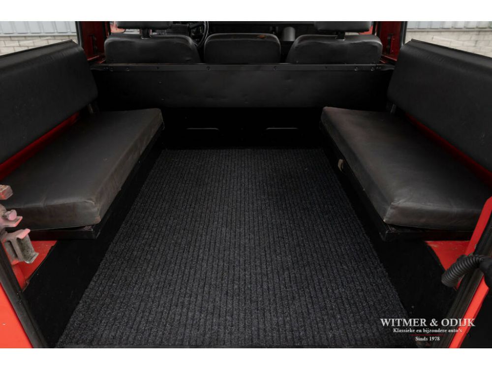 Wat doet een brandweerman als er geen brand is? Nee niet klaverjassen, zeker niet. Het rollend materieel moet ten alle tijden in topconditie zijn voor als het er op aan komt. Dit terwijl zo'n rode auto, gelukkig, niet veel op de weg komt. Deze bijzonder fraaie Defender werd jarenlang door een brandweerkorps gebruikt voor inspecties van gebouwen en als commandowagen. De lage kilometerstand vertaald beperkt gebruik, en zo ziet de auto er ook uit. Voorzien van een derde stoeltje voorin en opklapbare bankjes achterin. We maken er graag gordels voor u bij. Bijzonder is natuurlijk de 4 cilinder benzinemotor, in een Defender is die nimmer aan privé gebruikers verkocht. De goede zorg en garagestalling maakt dat de auto absoluut roest- en corrosievrij is, het rood is overal mooi gelijkmatig rood. Zie de foto's. Ook het interieur is zeker gezien de leeftijd van deze Land Rover in topconditie. Echt een liefhebbersauto die u overal brengt, van het centrum van Amsterdam tot een spannend bospad. De off-road capaciteiten van de Defender behoeven weinig toelichting. In deze kleurstelling konden wij nog geen Defender met benzinemotor aanbieden, zoveel brandweerauto's zijn er ook niet. Rijklaar bij ons te bezichtigen. Goed hé die kleur, het is al zo saai op de wegen.. Zie onze website voor meer dan 60 foto's www.witmerodijk.nl of u gebruikt de volgende link, https://witmerodijk.nl/te-koop/land-rover-defender-benzine-1989/2315