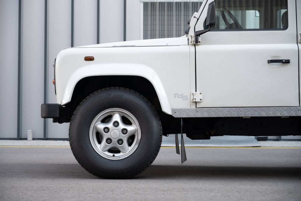 Registered in France and built in July of 1999, this Defender was delivered by Land Rover France SAS. This early TD5 presents in exceptional original condition. The chassis is immaculate with no previous repairs carried out and retains its original rear crossmember. Being a County specification, it benefits from carpeting throughout, a sunroof, body-colored wheel arches, and alloy freestyle wheels. The vehicle benefits from a large history file full of receipts from current and previous ownership. Mechanically, the vehicle has been maintained meticulously. It recently had two new front tires along with a new spare wheel and new shock absorbers fitted all around. Being a TD5, it drives beautifully with plenty of power and is a seriously usable everyday Defender. This is a notable step up from the 300 TDI predecessor in terms of usability and performance. The Car Vertical report, available to interested bidders, shows no financial encumbrances, history of mileage discrepancies, or accident damage. Finished in the Export Spec classic Alpine White LRC456, complemented by a Techno Twill interior, the vehicle remains in very original and unaltered condition – a rarity in today’s Defender market. It sports a set of factory Freestyle wheels which are part of the County specification package.