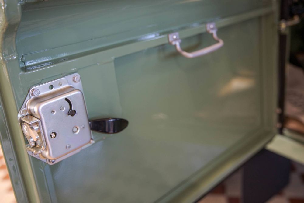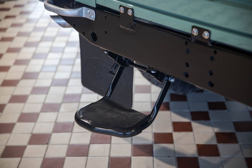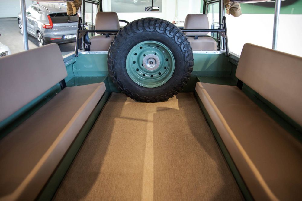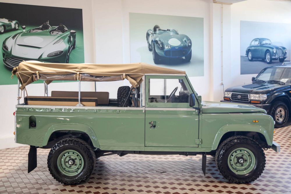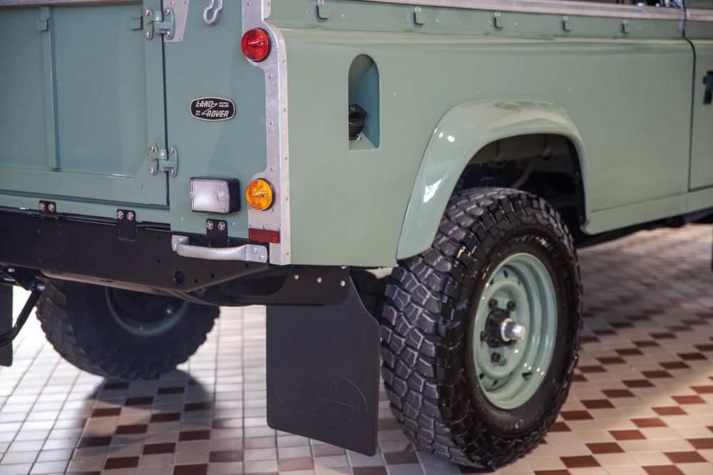 This Defender 110 has 188,000 km on the odometer and has recently been given a “restomod” style rebuild. It is now dressed in Light Green, an original color from the Land Rover catalog which contrasts beautifully with the brown military-style canvas top. It also mounts new tyres, galvanized bumpers and trims and the classic silver grille.