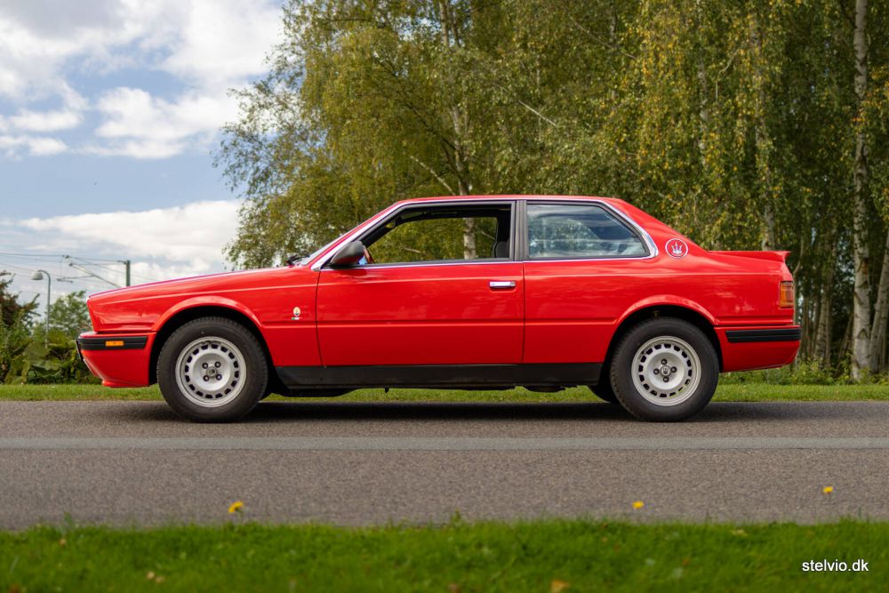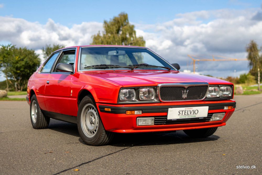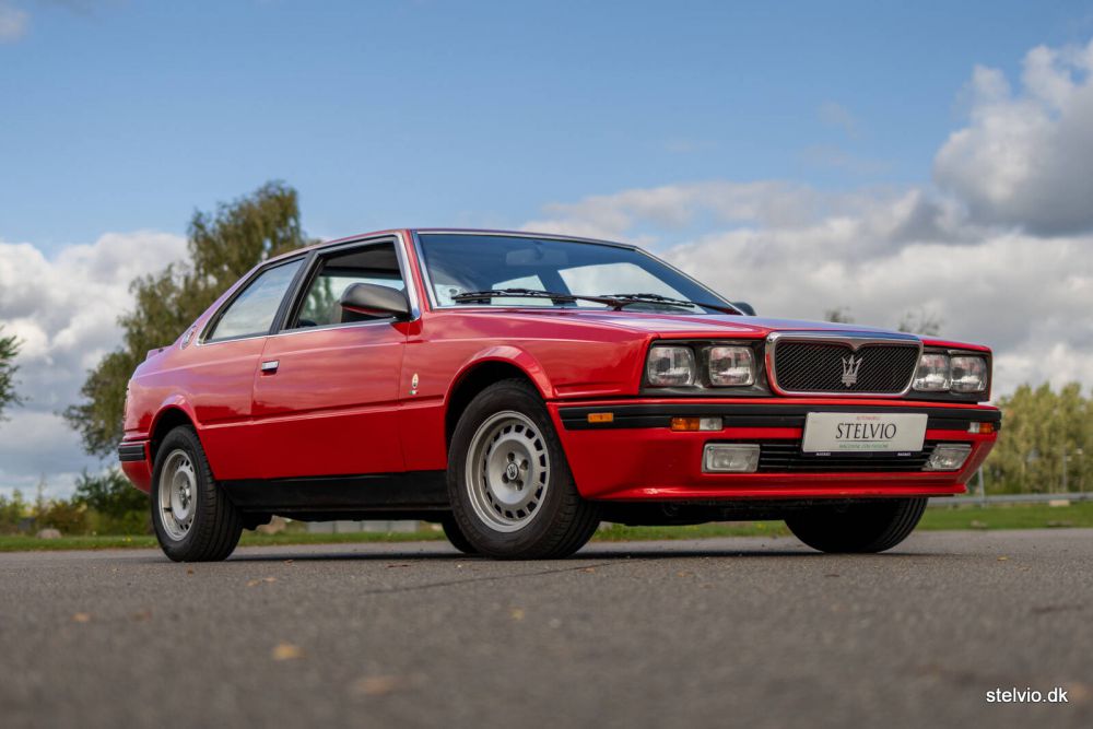 The Biturbo models ensured the survival of Maserati from the Gran Turismo models of the 70’ties to the ownership of Ferrari and the Maserati models we know today. With a mixed reputation (sometimes deserved, sometimes not) but always compact and well driving. Often the issues were electrical because of bad connections, whereas the mechanical quality actually was quite good. Maserati has always produced great engines based on motorsport, and the transmission of the Biturbo is made by German manufacturer ZF and rock solid. One turbocharger on each cylinder row is the recipe for probably the most efficient way to design an engine. The exhaust pulses from 3 cylinders are optimal for a turbocharger, which is why for many years this configuration was dominant in motorsport including Formula One. The early Maserati Biturbo with carburetors were known for their temperament and notoriously difficult to start when warm. However, the later models with fuel injection like this 222 from 1988, were much easier to live with even though the characteristic of old school turbo charging providing a significant boost just before 4000 rpm certainly is there. The famous “ketchup effect” resulting from this is quite entertaining. The output of this engine is 220 bhp – it could be increased up to 330 bhp and even more for racing purposes. This 222 (2 doors, 2 liter engine, 2nd generation) is originally a Danish car. The car has been very well maintained and has just received major service including new Koni dampers and tires. On the road it drives excellent. It was repainted in its original color some years ago and still presents spotless. The output of 220bhp ensures quite respectable performance from the compact car, which is actually shorter than a BMW 3 Series from the same period. The comparison with BMW is not a coincidence as Maserati used various BMW parts in their car. The cabin has just been redone in a quality superior to the standard of Maserati and now includes real leather and Alcantara to please the lucky owner. Even the roof lining is now made from Alcantara and the dash board – which normally becomes quite tatty throughout the years – is now in excellent shape as well. Enjoy the pictures of the cabin, we think it is very nice and it was quite expensive to do by the way. And just to top it up, a periodic correct Blaupunkt Toronto was installed, in case the driver should be tired of listening to the glorious sound from the roaring V6. Please note, that the mileage is just 78,000 km.