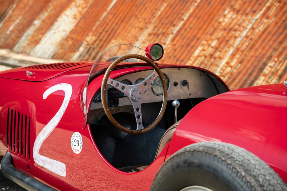 The car we offer here is a hand-crafted Maserati A6GCS Monofaro featuring a Siluro body fitted with the original engine and gearbox from chassis 2010, the car driven by 5-time Formula One World champion Juan Manuel Fangio. The engine and gearbox lay in storage for a considerable length of time before being acquired by the car’s current owner who himself stored the drivetrain until deciding to commission a replica chassis and body around the original engine.