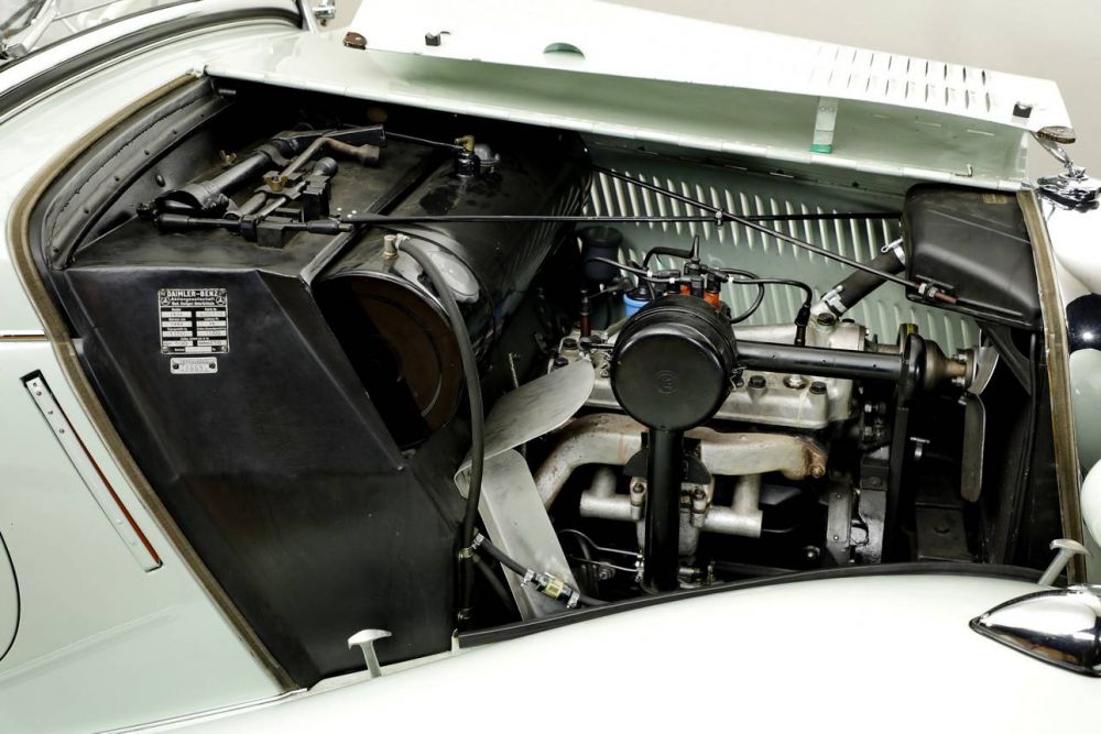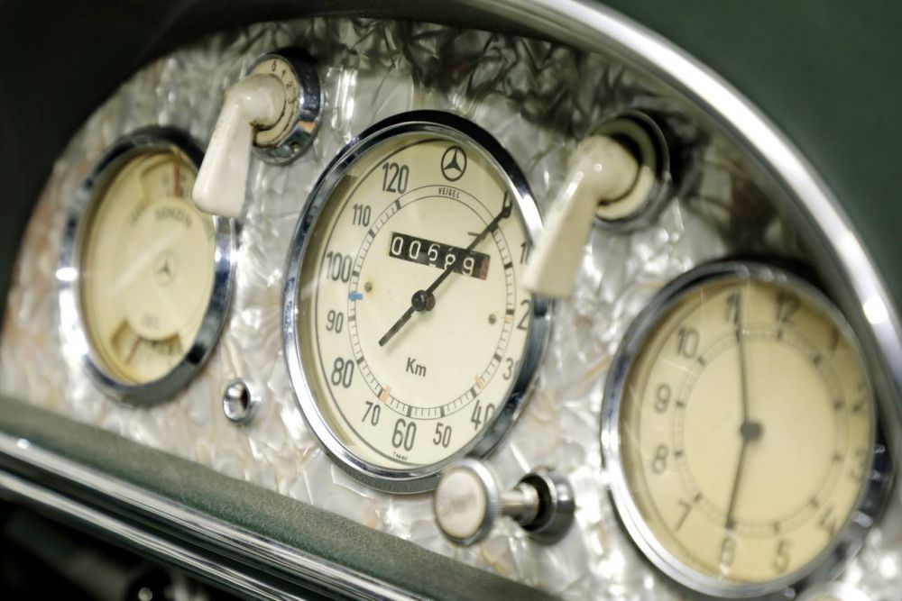 This Mercedes Benz 170 V Sport Roadster - was first registered in Germany in July 1938. Its later German owner in Hamburg (name known), who also had a residence in California, subjected the car to a restoration in the early 1980s, in which around 25,000 DM were invested - at that time already a handsome amount for the preservation of an old vehicle. In January 1986, this car then participated with its then owner in the 100th Anniversary Parade of the Automobile in Los Angeles, California, with the participation of Mercedes Benz of North America and the Mercedes Benz Club of America. A subsequent (last) owner, who owned this car until 2020, had made ongoing investments in restoring the car in various stages over the years. This includes extensive body work and painting (2001/2002), saddlery work in the interior (2002) and an engine overhaul (2006). The invoices for this work are available and total around EUR 65,000. In 2020, further restoration work was carried out on the body. The invoices for about 15,000 EUR are also available. The engine is not identical in number to the first delivery but is a type-correct model of this series. Overall, this compact car makes a convincing impression with its older restoration, which is very well preserved. It is also a rare rarity, as only 271 examples of the roadster version of were produced. A very exclusive share of the total production of the 170 V passenger car series with about 72,000 vehicles. The Mercedes Benz 170 V (W136 series) was introduced in 1936 as the successor to the 170 (W15) at the International Automobile and Motorcycle Exhibition in Berlin (IAMA). The development goal of the 170 V was to offer a cheaper and even more modern car of the middle class than the 170 already was. It was powered by a simpler 1.7-liter inline four-cylinder engine with 38 hp. The V in the designation stood for the front-mounted engine to distinguish it from its rear-engine counterpart, the Type 170 H, and to differentiate it from the predecessor 170 with a six-cylinder engine. The engine proved itself through its high reliability and its smooth running. The chassis of the 170 V was a newly designed X-shaped oval tube frame, which was lighter and at the same time more robust than the box frame used until then. In addition to the numerous two- and four-door sedans produced, as well as vans and the pure chassis for special bodies, there were also the open-top versions Cabriolet sedan, Cabriolet A (two-seater) and B (four-seater), and the roadster. The Cabriolet A and the Roadster looked similar at first glance. In the Roadster, the sloping rear section was slightly longer and allowed for two additional fold-out emergency seats - the so-called mother-in-law seat, which alternatively served as a luggage compartment. In addition, its soft top rested on the body as usual when unfolded. The Roadster, on the other hand, had an ingenious roof design that completely recessed the soft top into the body (behind the seats). This creates an elegant side line without a disturbing soft top bulge. In addition, the windshield can be folded down for a particularly sporty character and the ultimate feeling of open-top driving. The body of the Roadster was manufactured at the Daimler-Benz plant in Sindelfingen. The Roadster was by far the most exclusive variant of the 170 V, with only 271 examples produced between 1936 and 1942.