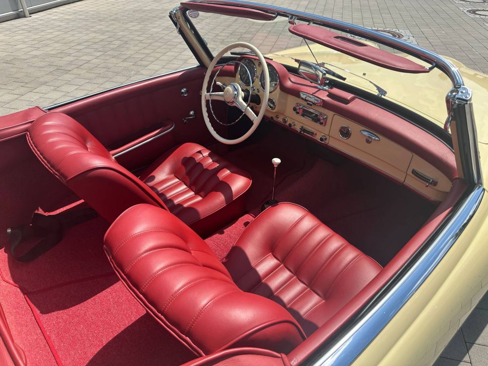 Dieser wunderbare Mercedes-Benz 190 SL Roadster in Elfenbein mit rotem Interieur und schwarzem Verdeck wurde im Juli 1957 in Amerika erstzugelassen. Die zurückliegende Frame-off Restauration beinhaltet die Karosserie, Lackierung, Interieur und die komplette Technik. Hierbei wurde das Fahrzeug in der Auslieferungsfarbe „Elfenbein“ lackiert und das Interieur in rotem Leder ausgeführt. Dieser wunderschöne 190 SL wird mit einem neuen Kundendienst, neuen Reifen mit Weißwand und Hauptuntersuchung ausgeliefert.
