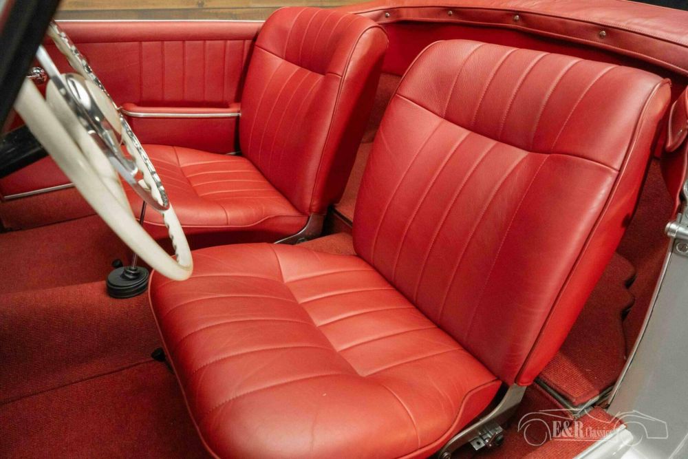 Het lakwerk van deze Mercedes-Benz 190 SL is uitgevoerd in een stijlvol zilvergrijs, dat prachtig contrasteert met de zwarte soft top. De klassieke wieldoppen geven het geheel een elegante uitstraling, passend bij zijn tijdloze design. Binnenin verwelkomt het rood lederen interieur u in een sfeer van luxe en nostalgie. Het samenspel tussen het rode interieur en de zilvergrijze carrosserie zorgt voor een unieke visuele ervaring die zowel klassiek als opvallend is. Deze kleurencombinatie versterkt het exclusieve karakter van de auto en benadrukt de kwaliteit van de restauratie.