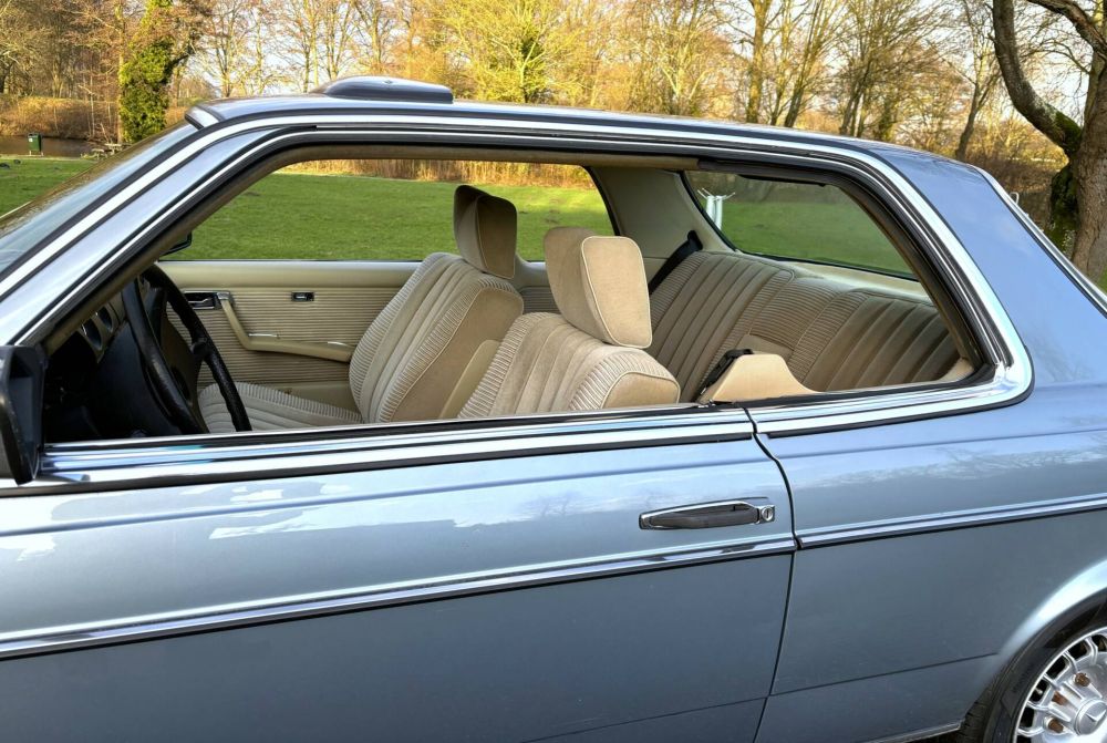 The exterior looks beautiful and the metallic paint has a nice deep shine. The doors close like a safe and all seams are correct. The coupé has just been partly repainted in the original colour ‘grau-blau metallic 906’ and the quality of the paintwork is excellent. The metallic paint looks very clean with only a few signs of use. The roof still has the original paint and there it has aged slightly. It is a brilliant colour, especially when combined with the green tinted glass and beige interior. It also looks great thanks to the original crown cork alloy wheels. The interior is completely original and excellently preserved. The seats have the beloved ‘Pullman’ velour upholstery and the fabric is completely pristine with only a scuff mark on the left seat. At the time, this velour upholstery was an expensive option of a whopping DM 1,465.- and almost as expensive as leather. It was popular though, as it is nice and stiff and looks nice. The dashboard exudes classic Mercedes quality and everything works as it should. Also at extra cost was the iconic Becker Mexico radio cassette recorder with engine antenna. Both the radio and engine antenna still work perfunctorily. The original headlining looks neat, also around the electric sunroof.