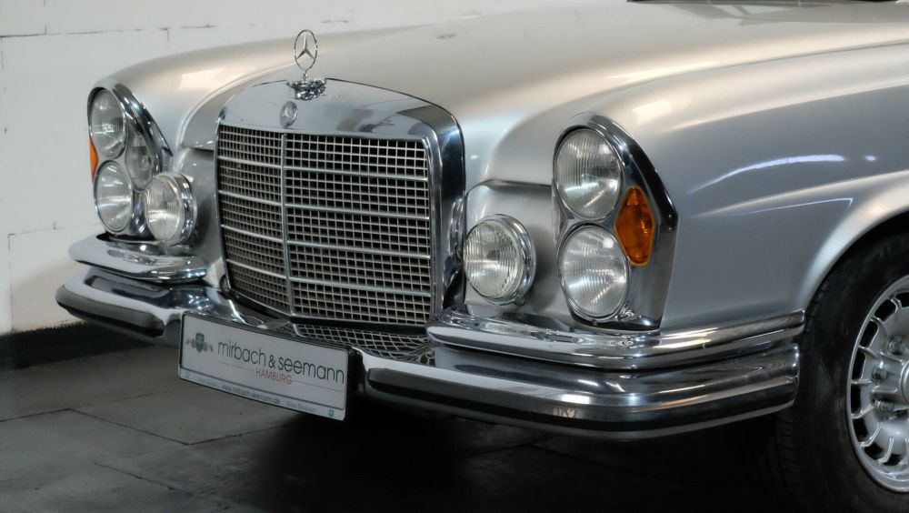 Eine etwas flachere Motorhaube sowie ein niedrigerer Kühlergrill führten zu der inoffiziellen Bezeichnung „Flachkühler“- Coupé oder Cabrio. Diese späten W 111-Versionen sind heute am begehrtesten. Dieses Mercedes 280 SE 3,5 Coupé im eleganten Silber-Farbton wurde 1970 erstmals zugelassen und ist eines dieser gesuchten „Flachkühler“ Coupés mit der damaligen Topmotorisierung.